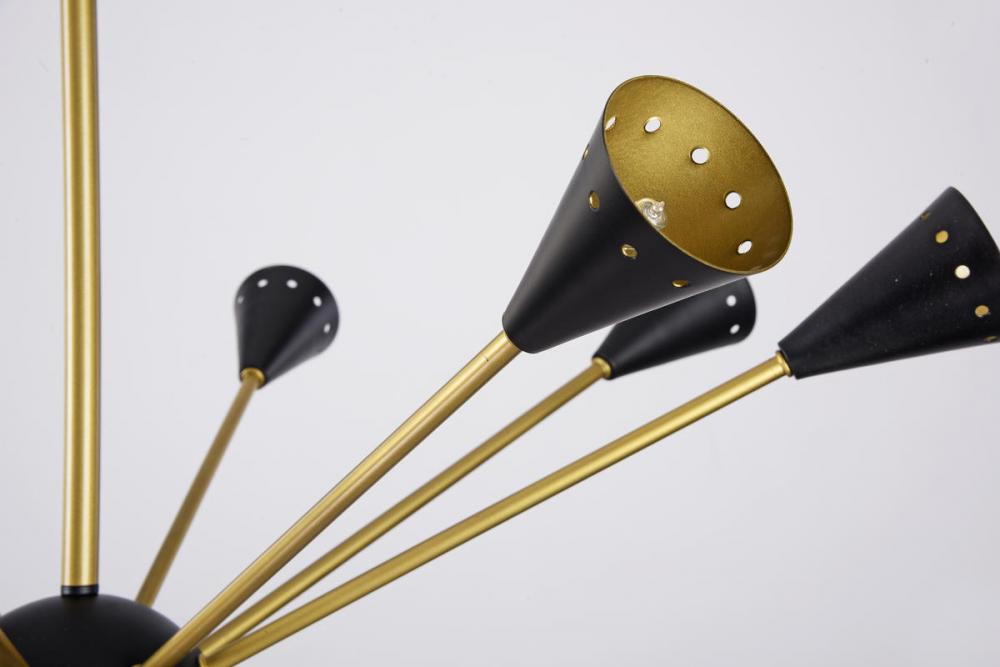 This modern ceiling fixture is in a matte black finish. The frame is made out of metal with champagne gold horns. Sixteen G9 bulbs (sold separately) can provide better illumination in any of your rooms.
