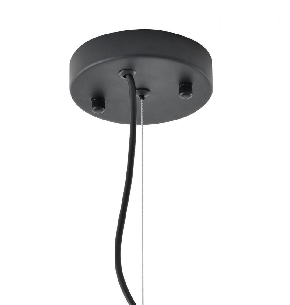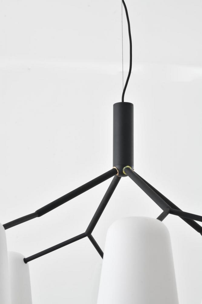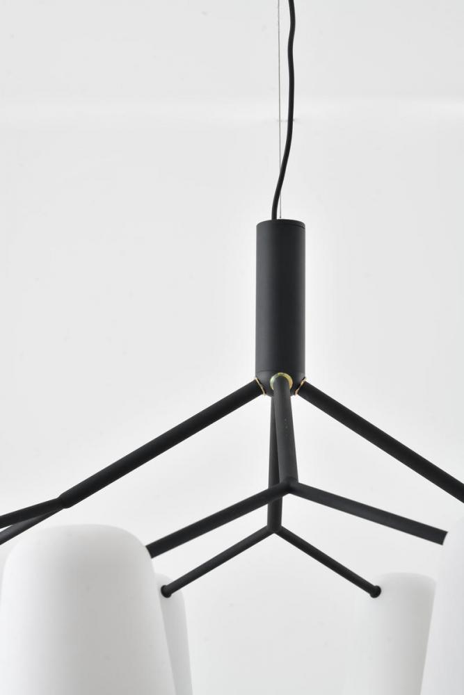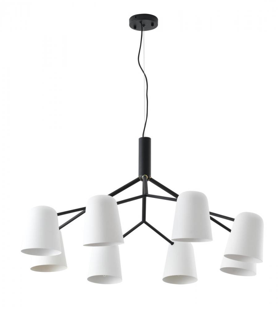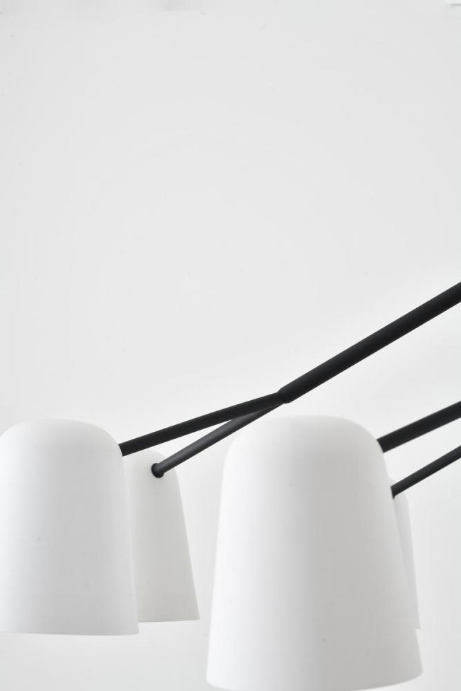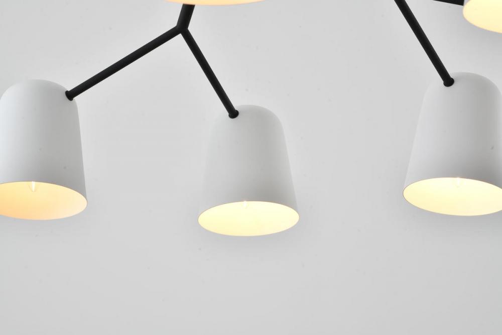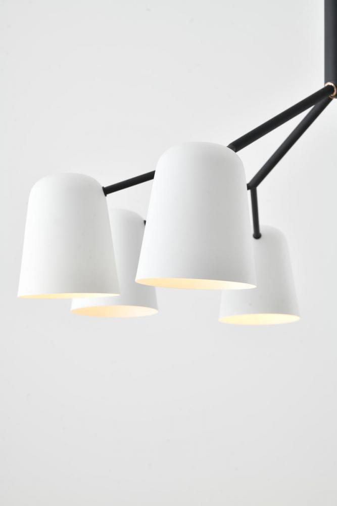 This chandelier is in black and white finish. The frame is made out of metal in black, and it comes with white aluminum shades. The adjustable cord link makes this fixture suitable for most ceiling heights.