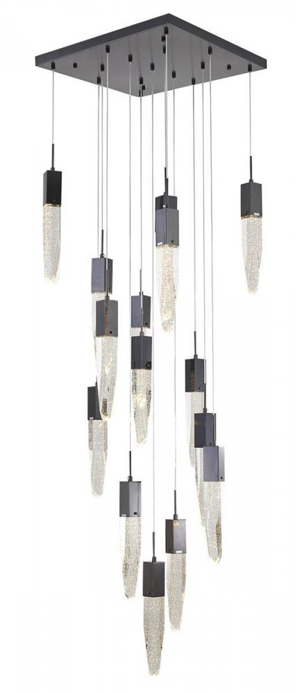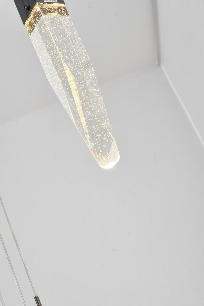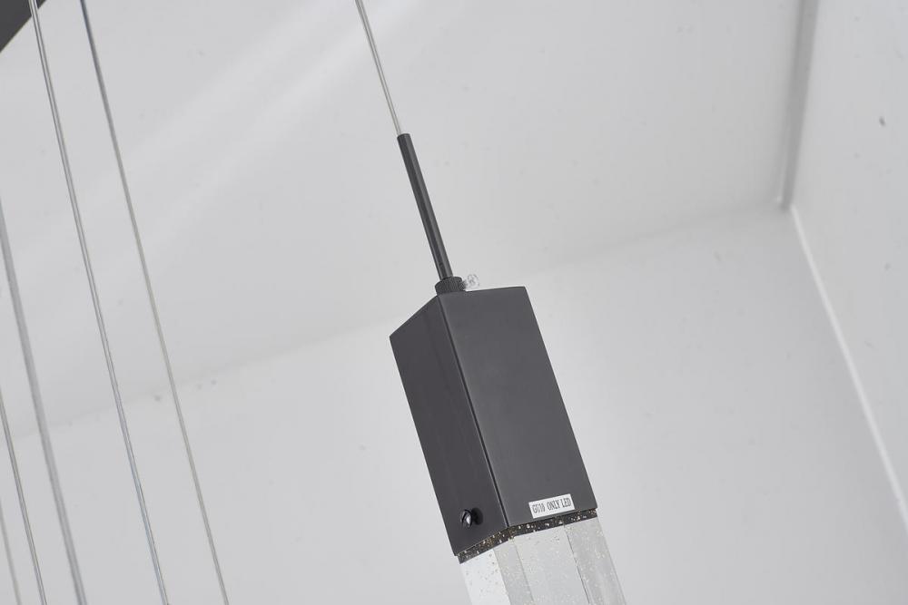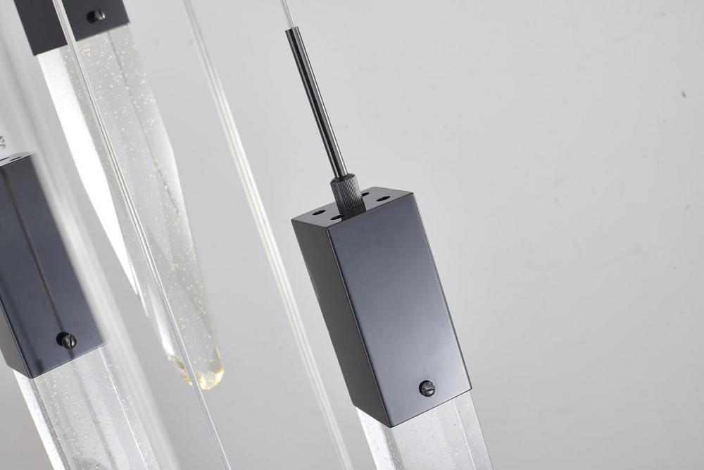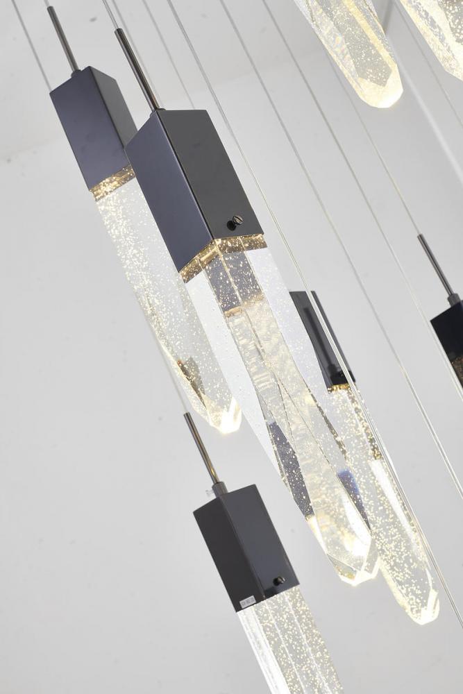 This exquisite chandelier is in a black finish. The frame is made out of metal, and it comes with hanging bubble iceberg crystals. The adjustable cord links make this fixture suitable for most ceiling heights.