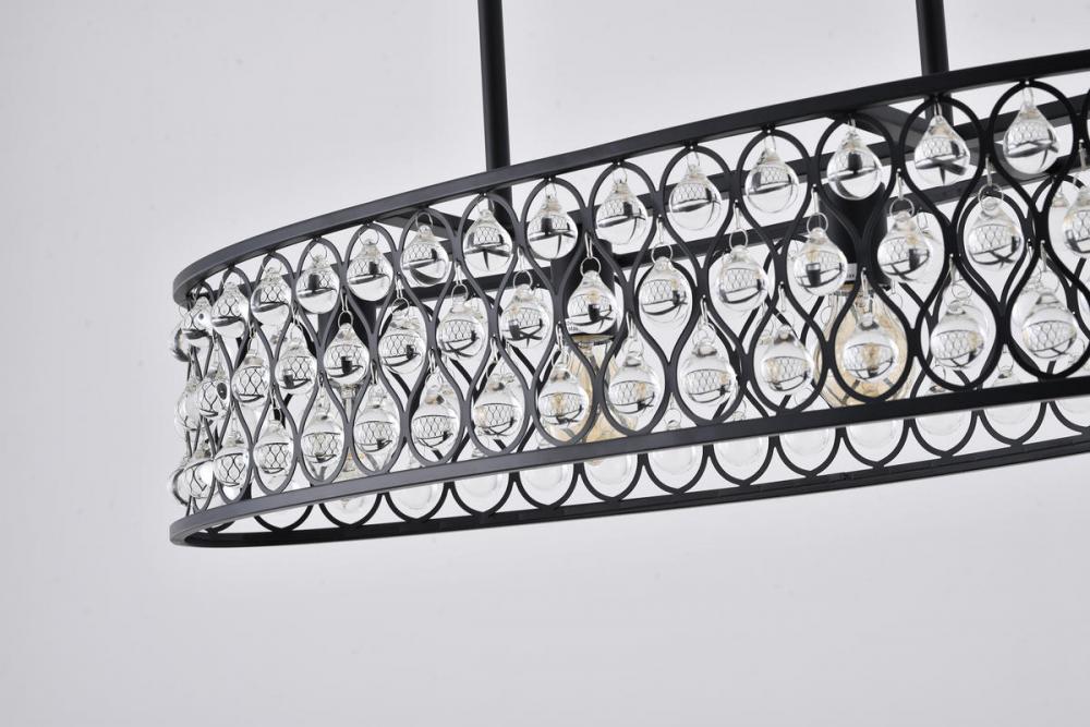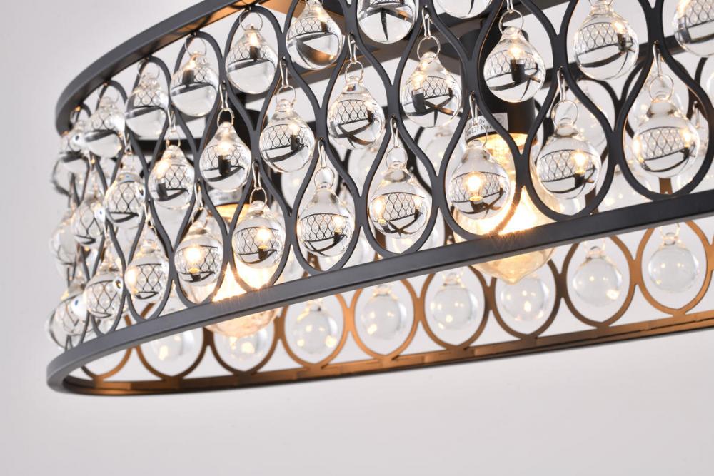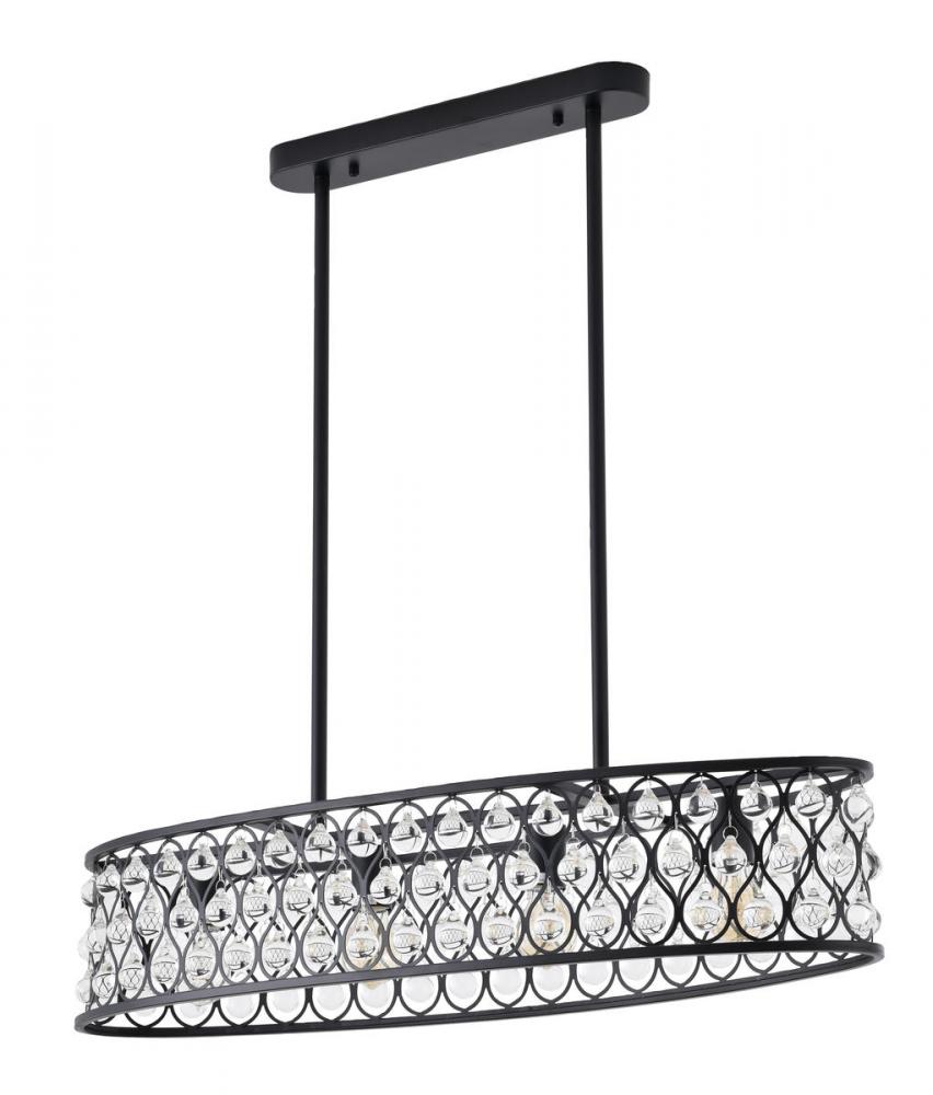This exquisite chandelier is in a black finish. The frame is made out of metal, and it comes with clear crystals hanging drops. The adjustable rod link makes this fixture suitable for most ceiling heights