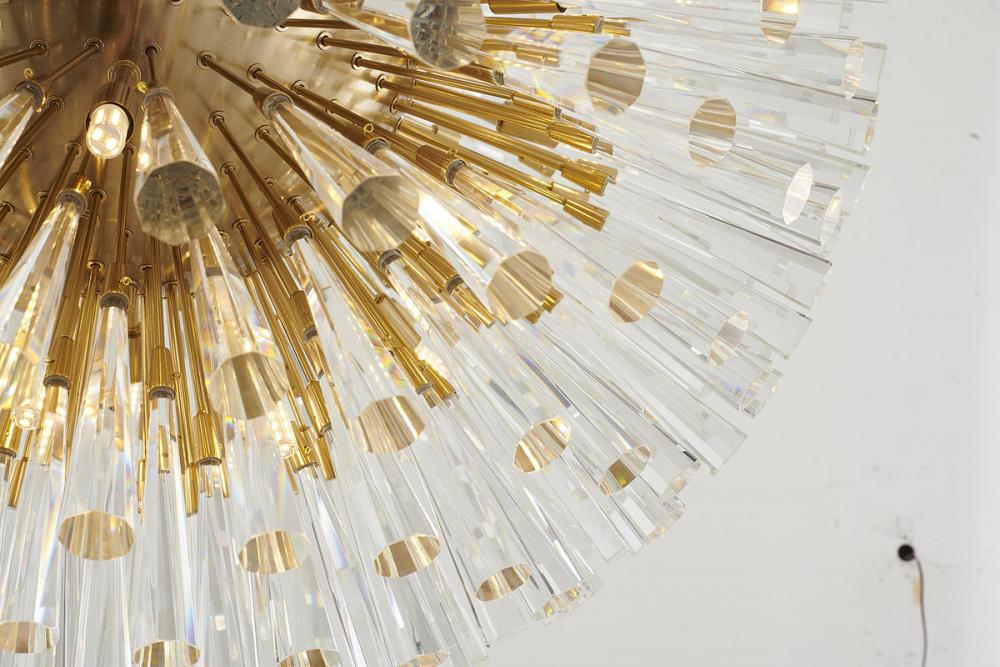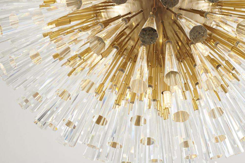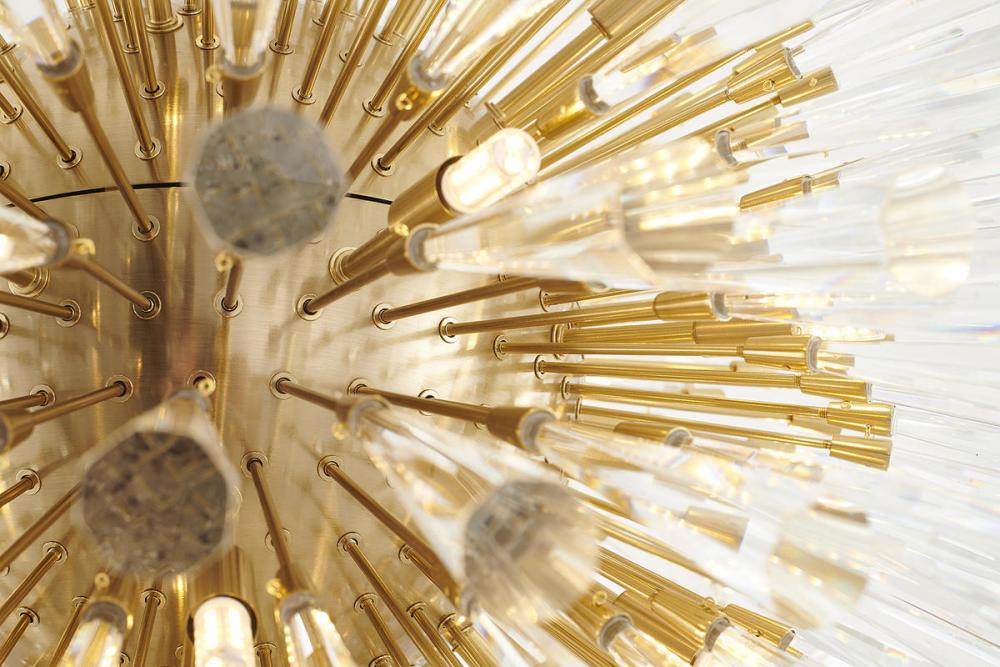 This exquisite chandelier is in a brass finish. The frame is made out of metal, and it comes with clear crystal spikes. The adjustable cord links make this fixture suitable for most ceiling heights.