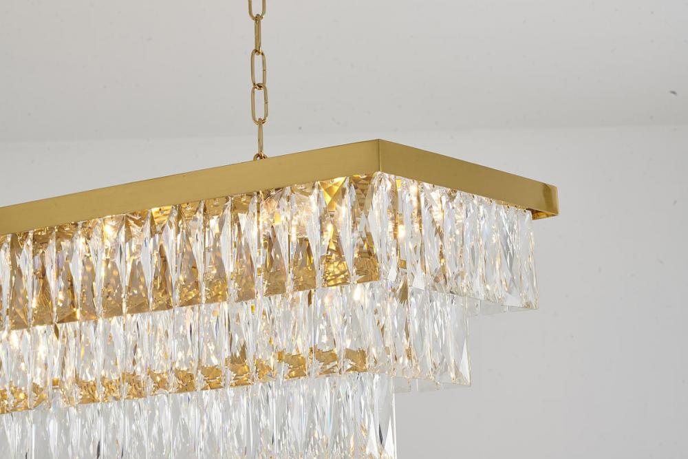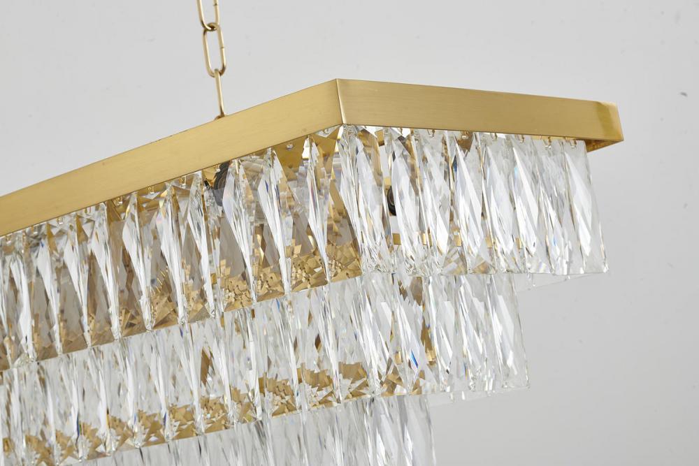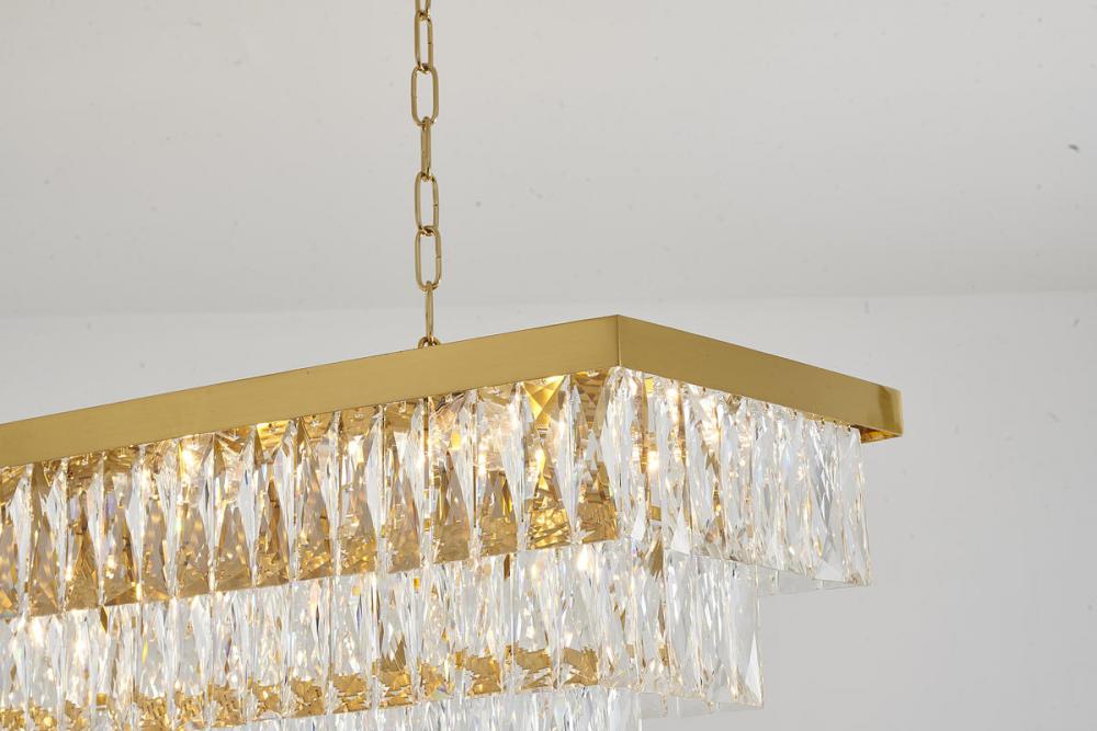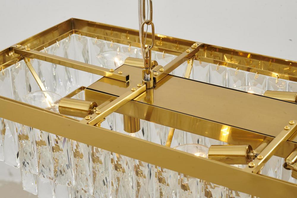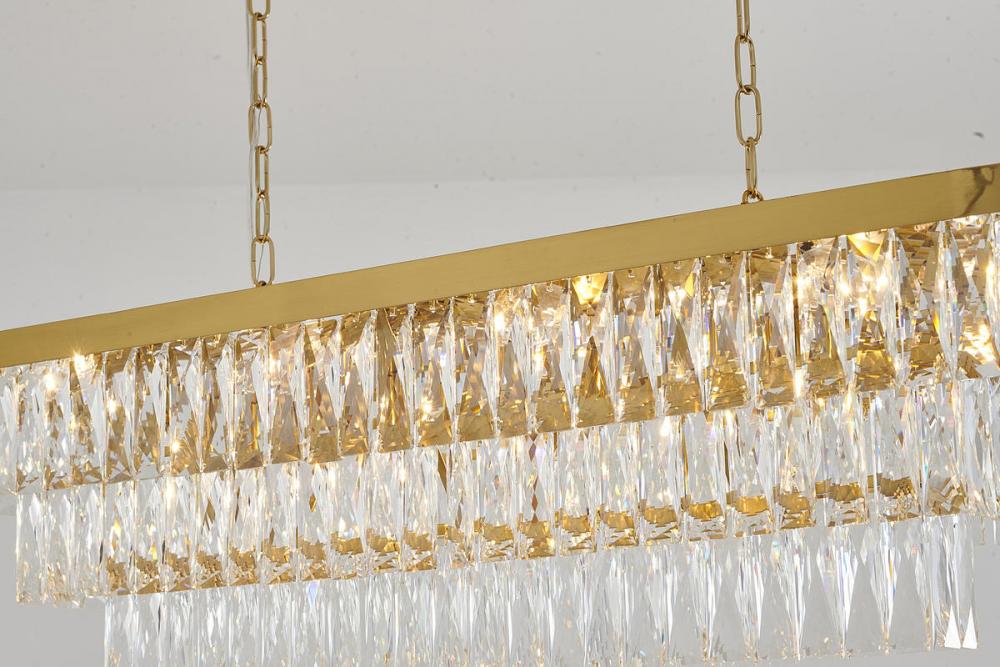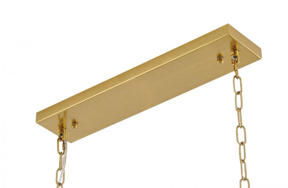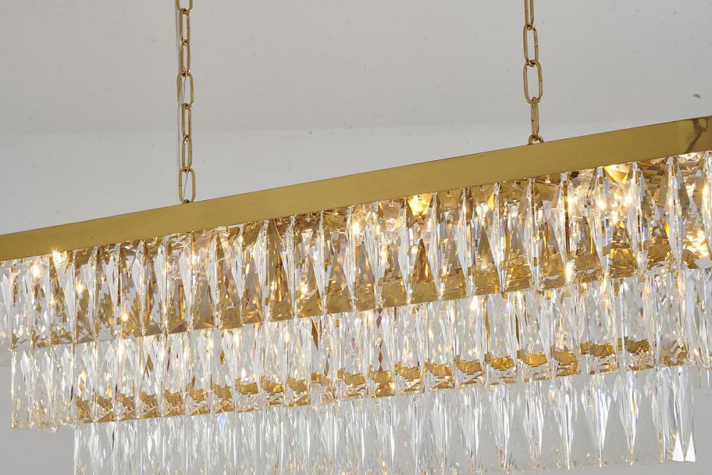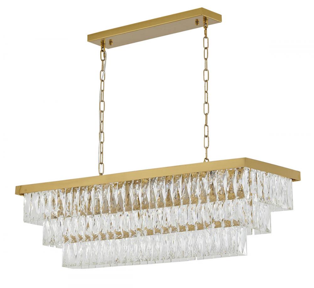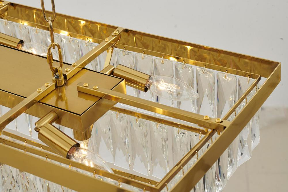 This exquisite chandelier is in a stain brass finish. The frame is made out of metal, and it comes with clear hanging crystals. The adjustable chain links make this fixture suitable for most ceiling heights