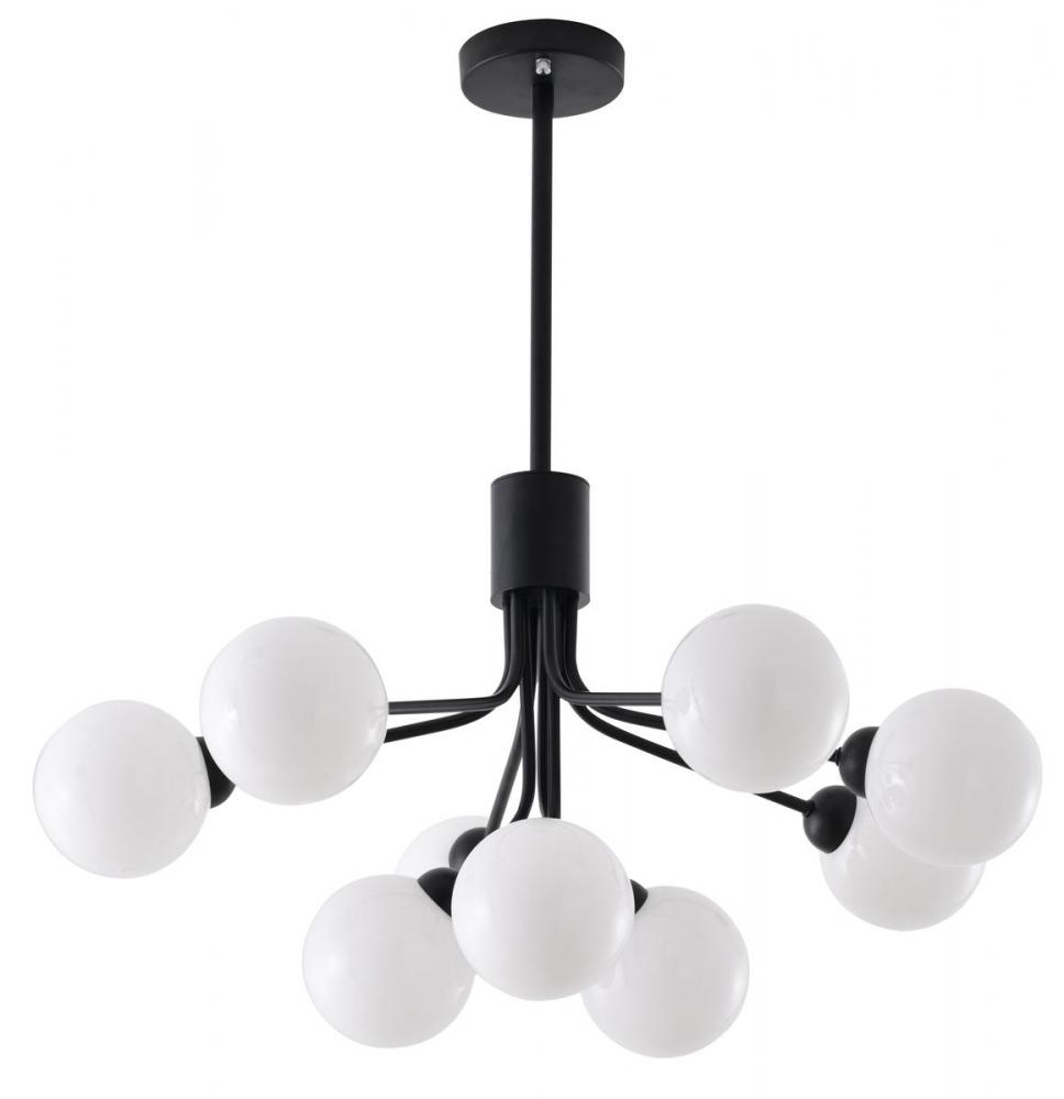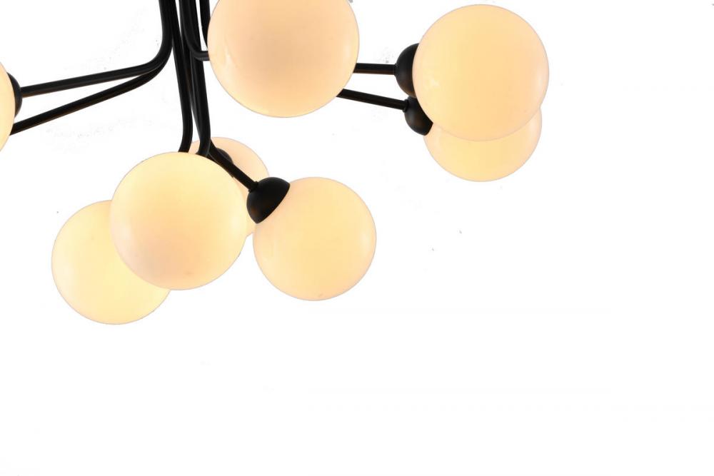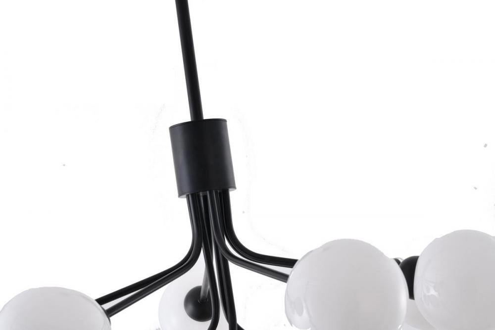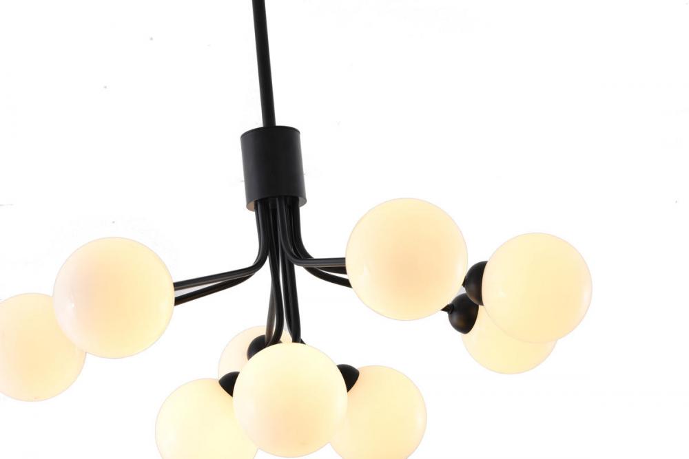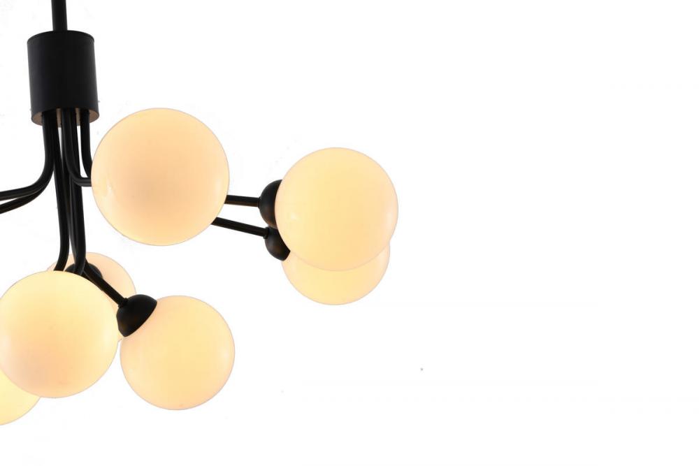 This exquisite chandelier is in a black finish. The frame is made out of metal, and it comes with white glass globe shades. The adjustable rod link makes this fixture suitable for most ceiling heights.