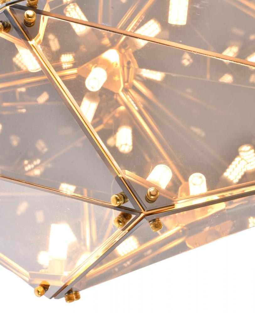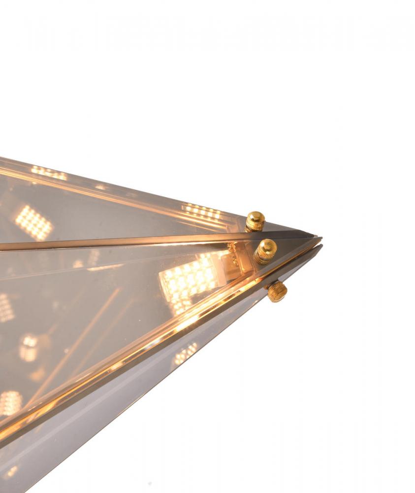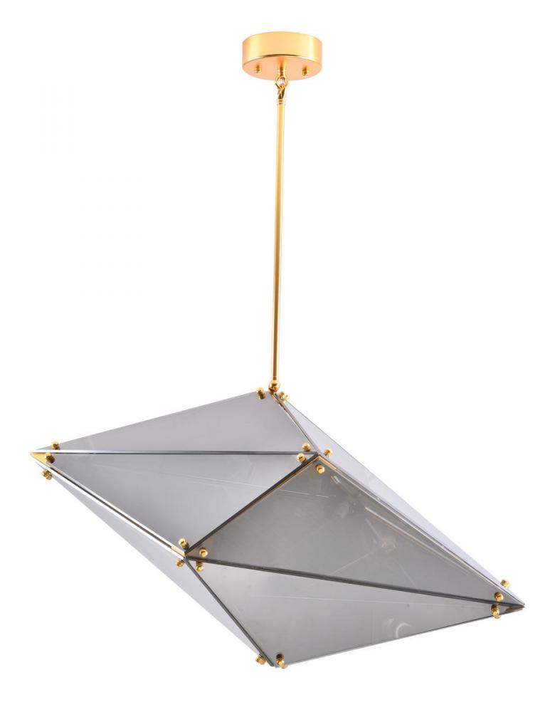 This unique chandelier is in a gold finish. The frame is made out of metal, and it has a smoke glass shade. The adjustable rod link makes this fixture suitable for most ceiling heights.