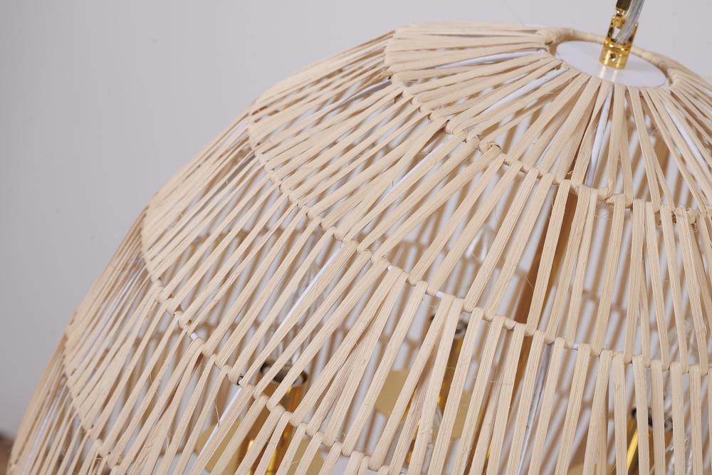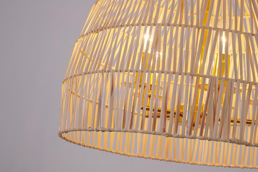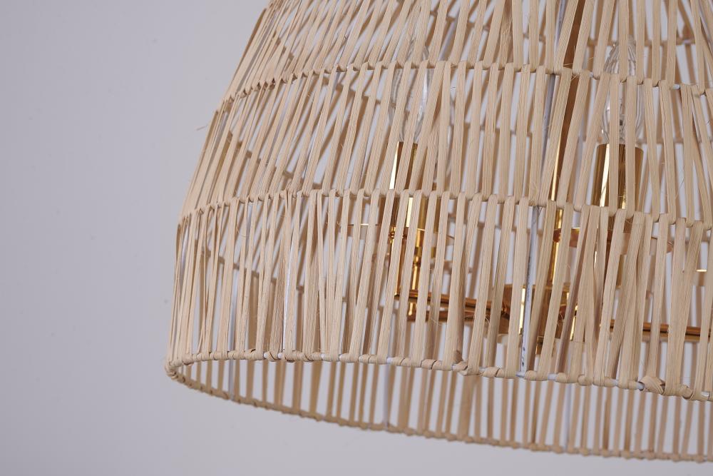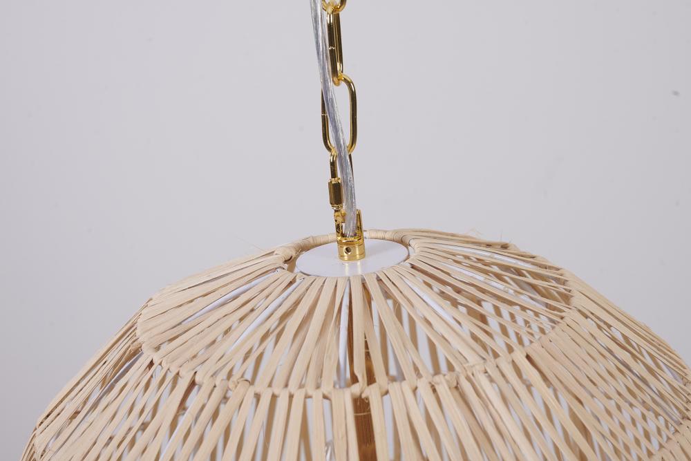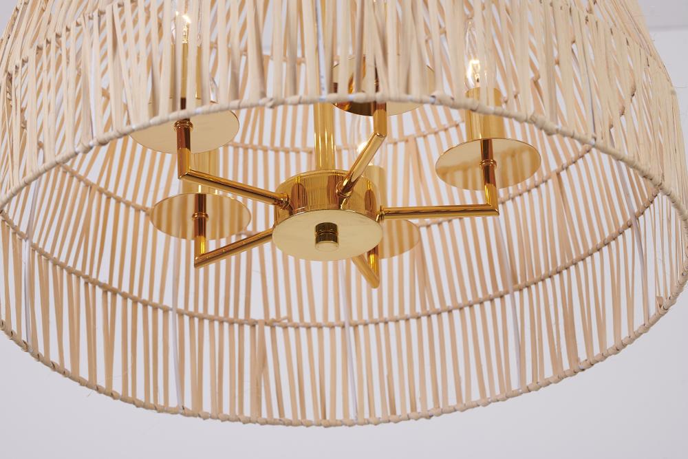 This chandelier is in a gold finish. It comes with a natural white wood vine basket and gold hardware. The chain length of 2.5 meters is provided.