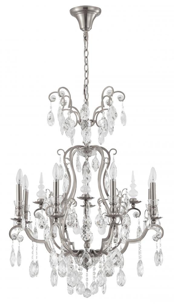 This chandelier is in a dark grey finish. It comes with clear hanging crystals. The chain length of 60 inches is provided and the chain length is adjustable.