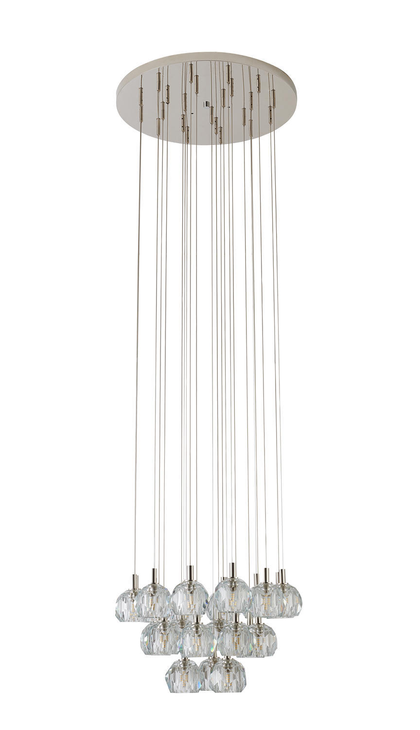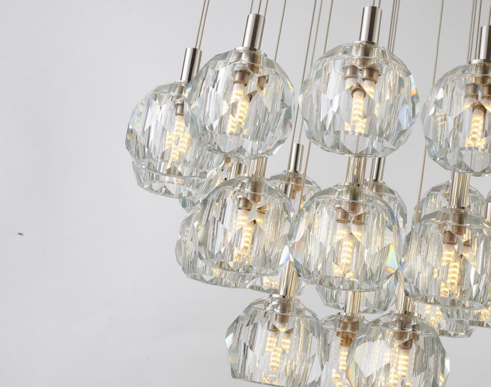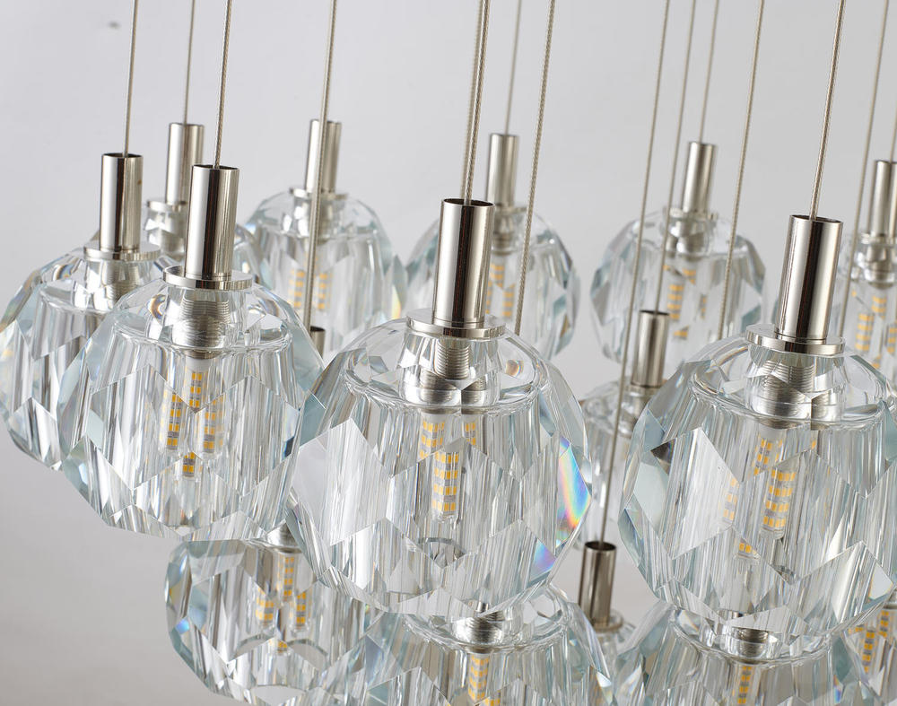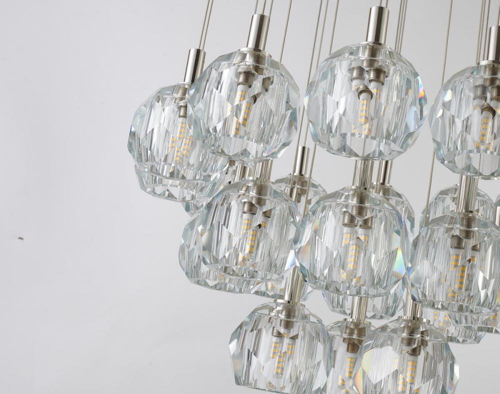 This exquisite chandelier is in a polished nickel finish. The frame is made out of metal, and it comes with crystal balls in clear color. The adjustable cords links make this fixture suitable for most ceiling heights.
