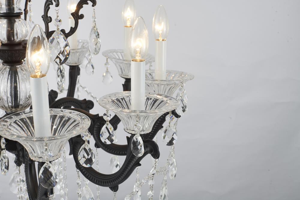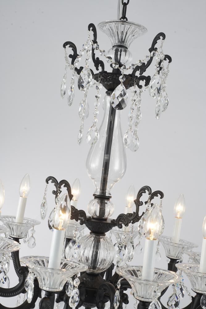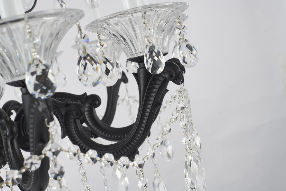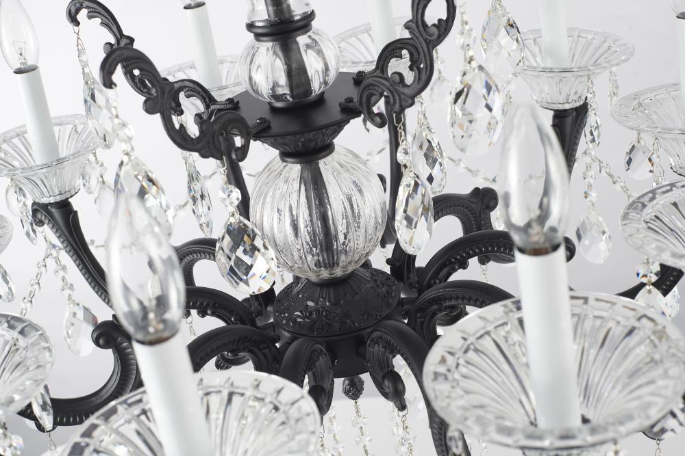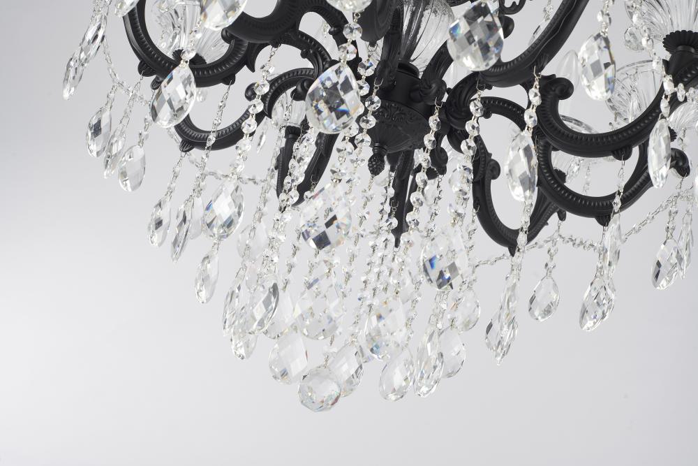 This chandelier is a satin black metal frame chandelier. It comes with clear hanging crystals. The chain length of 60 inches is provided and the chain length is adjustable.