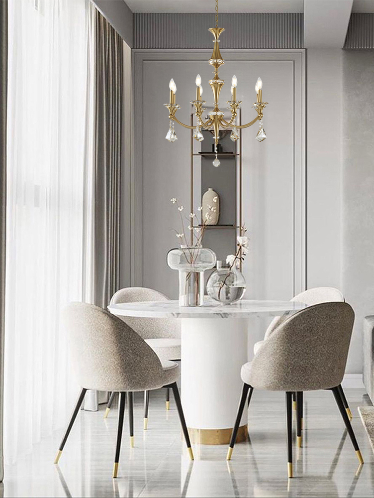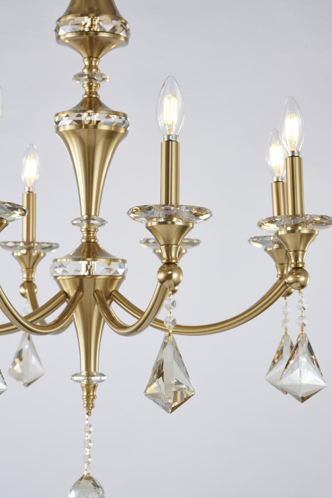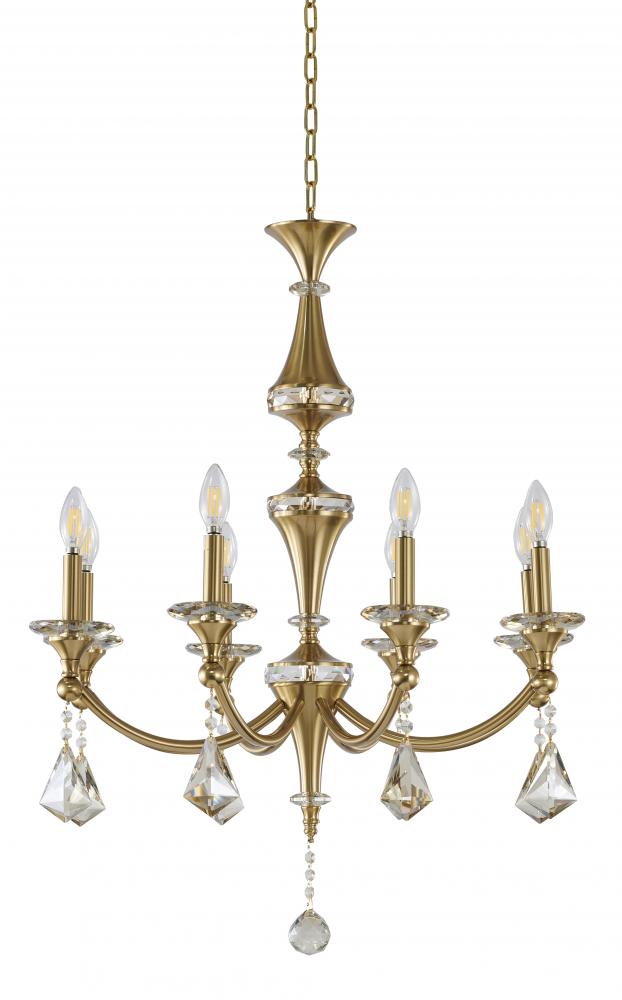 This chandelier is a satin brass frame chandelier. It comes with champagne hanging crystals and accents. The chain length of 1.5 meters is provided and the chain length is adjustable.