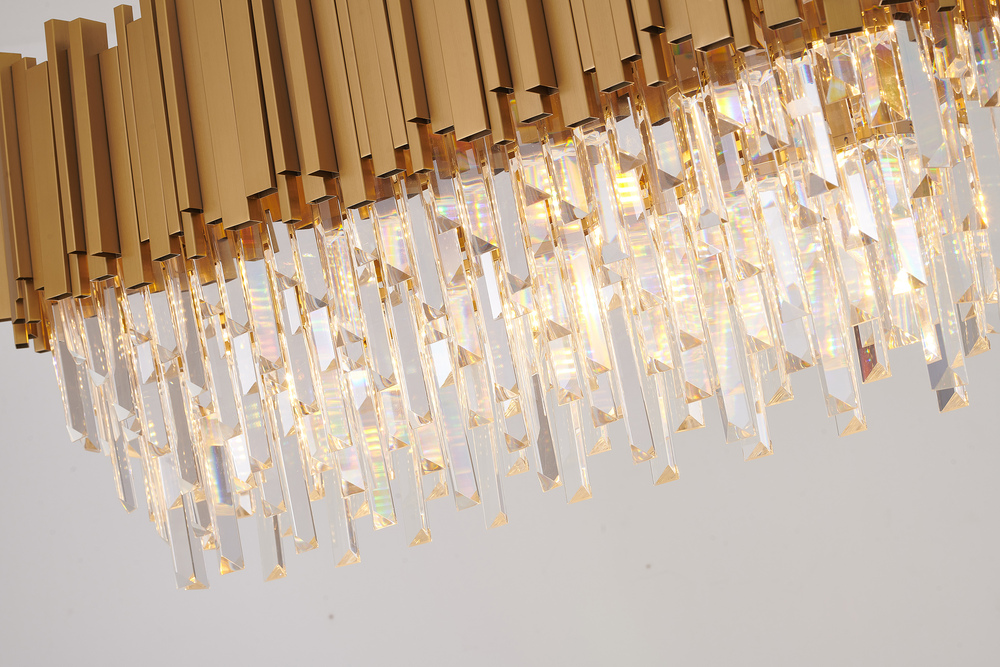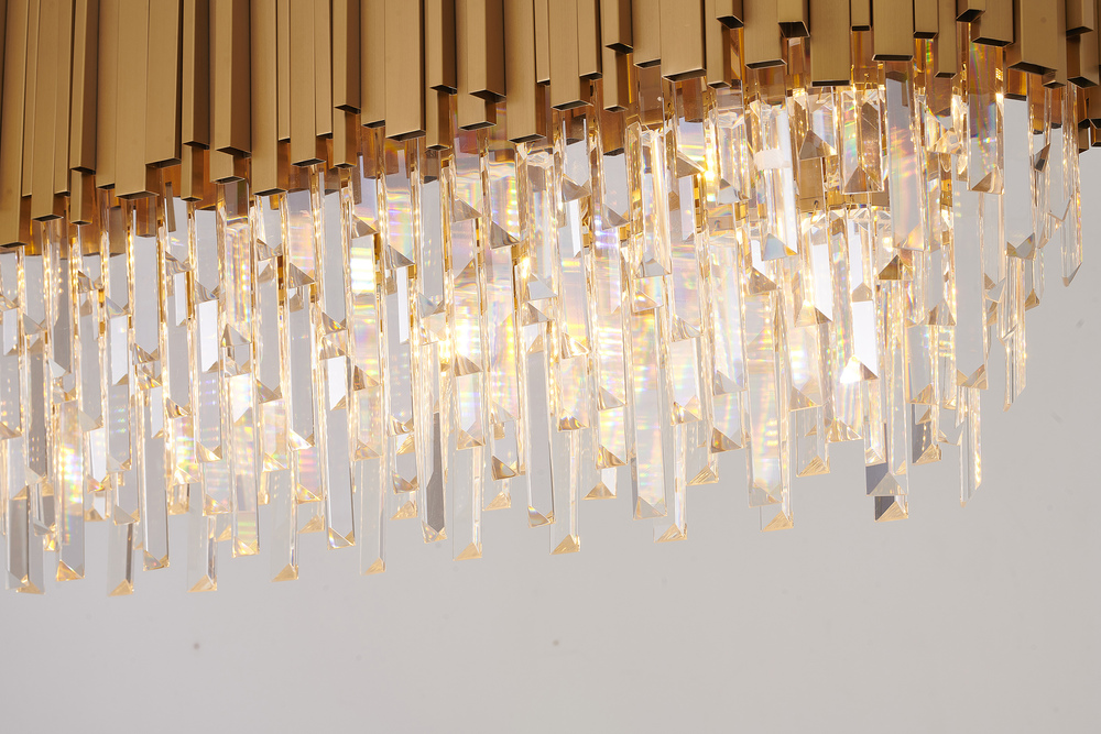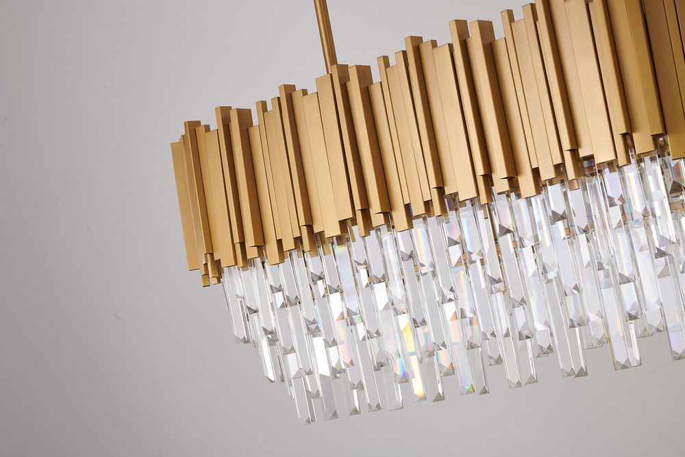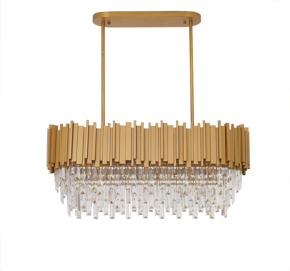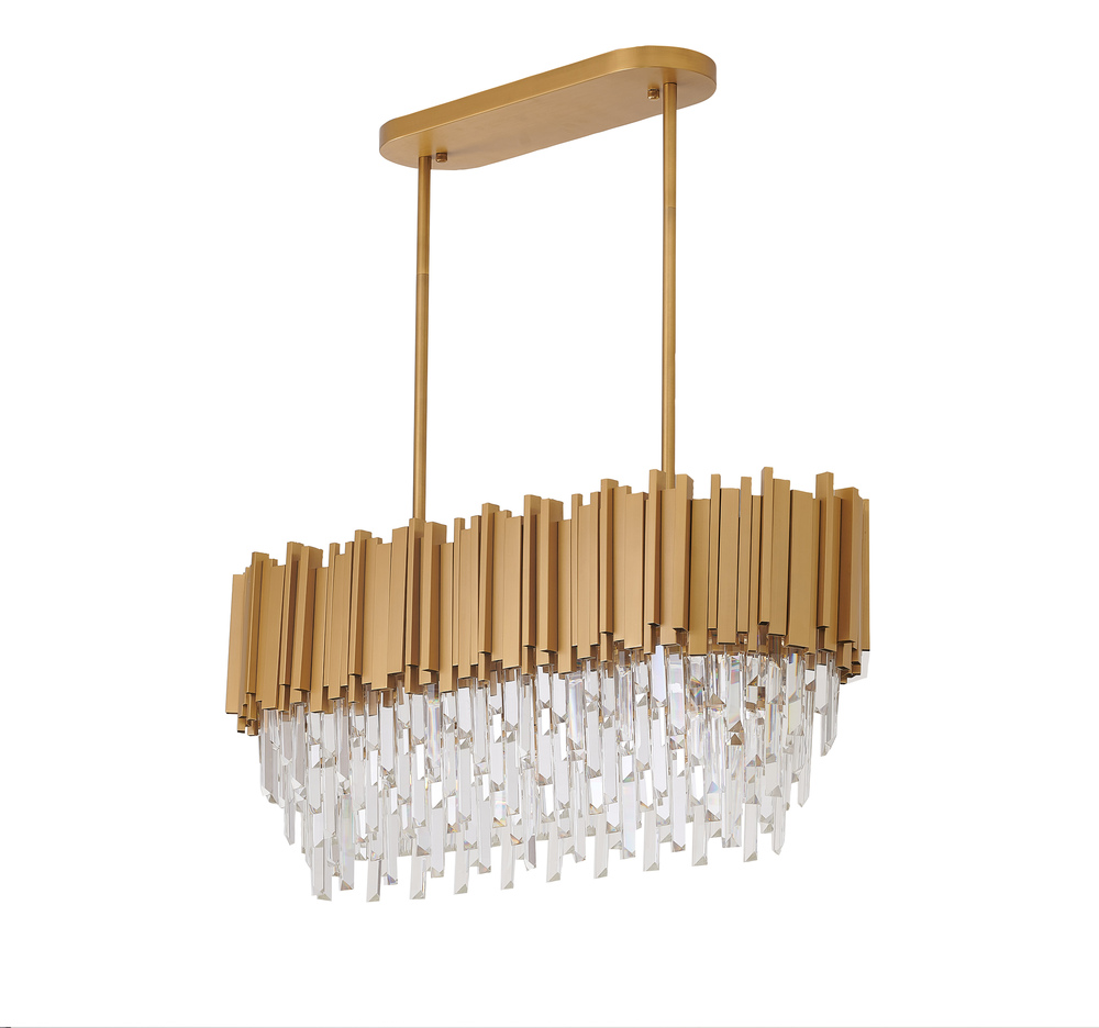 This exquisite chandelier is in a satin brass finish. The frame is made out of metal, and it comes with clear hanging crystal accents. The adjustable rod links make this fixture suitable for most ceiling heights.