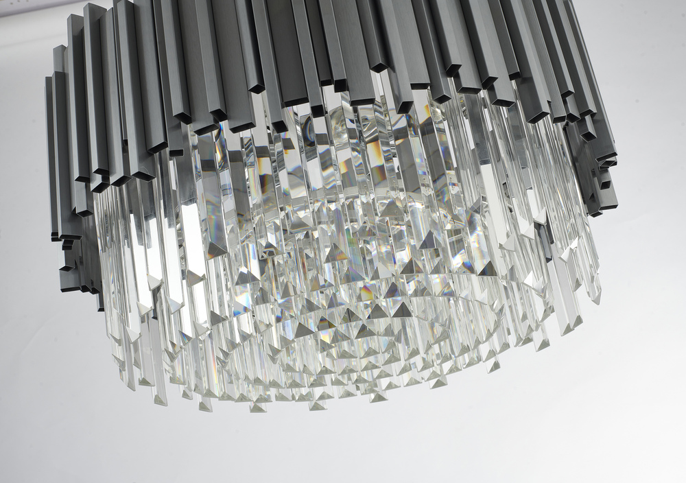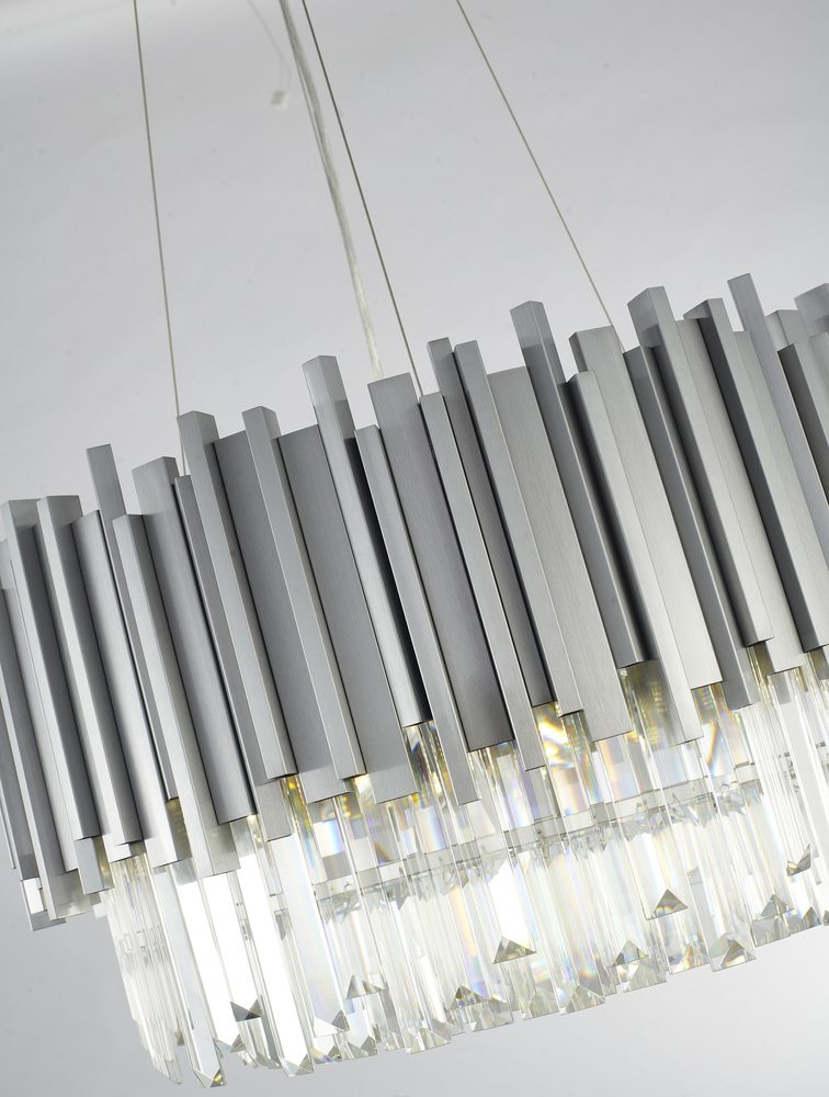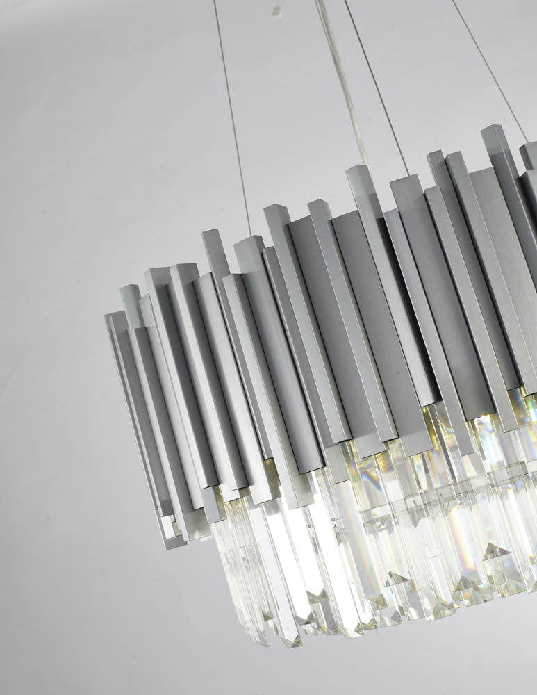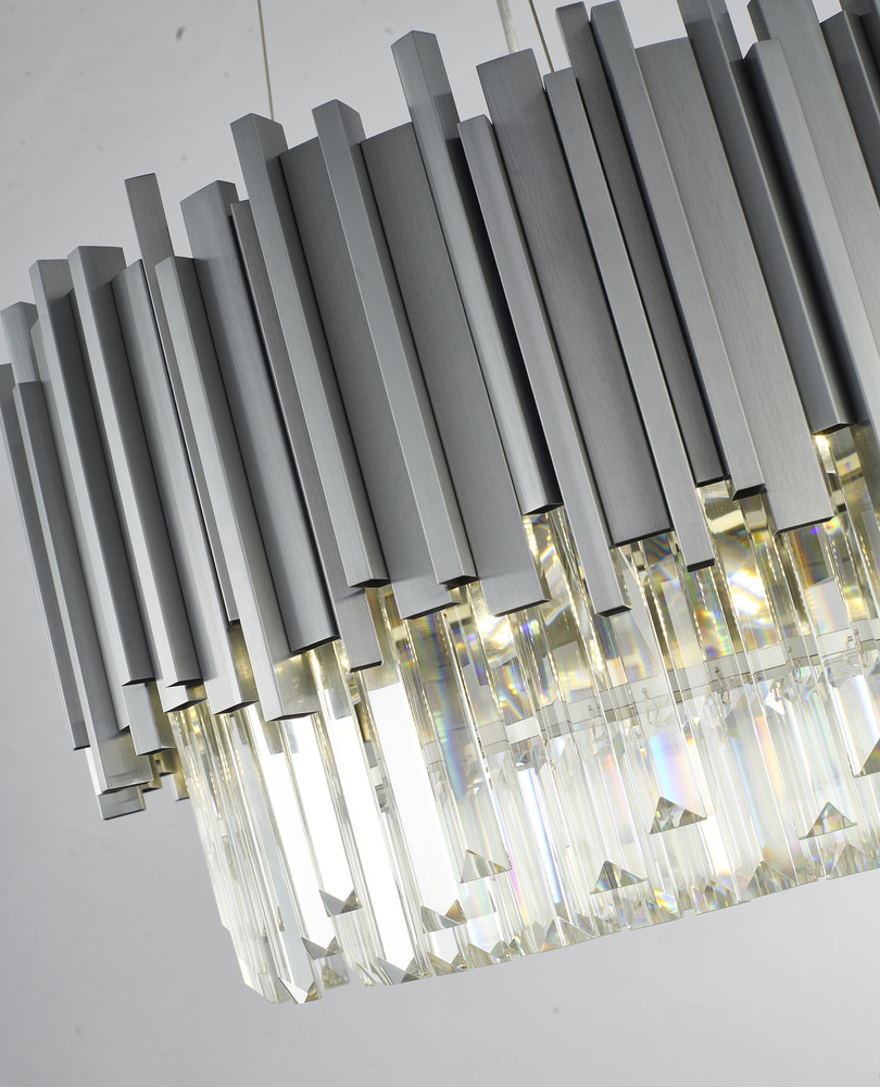 This exquisite chandelier is in a silver finish. The frame is made out of stainless steel, and it comes with clear hanging crystals. The adjustable cord links make this fixture suitable for most ceiling heights.