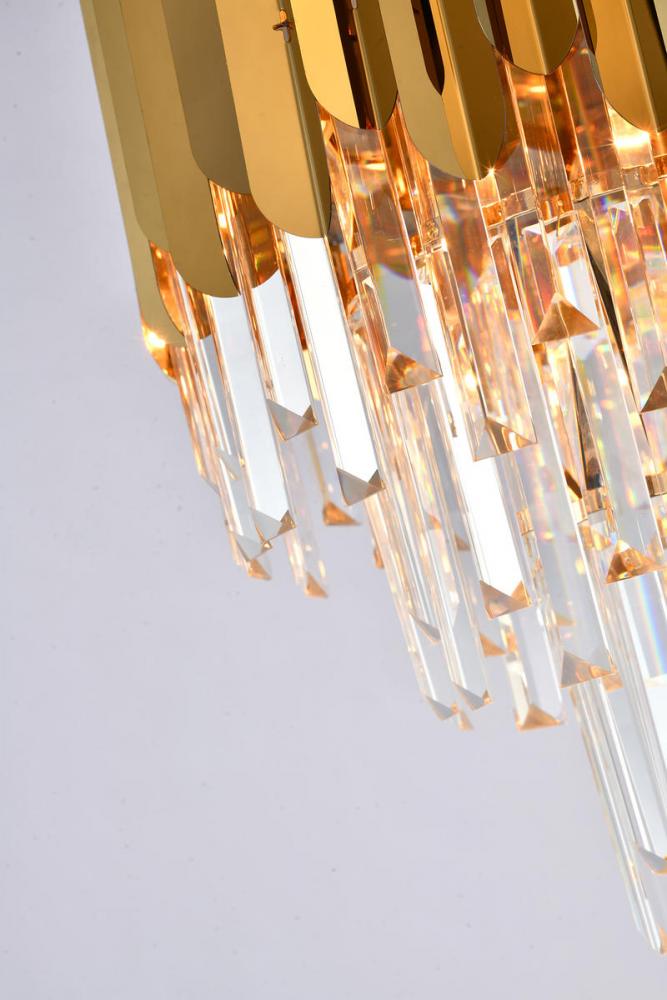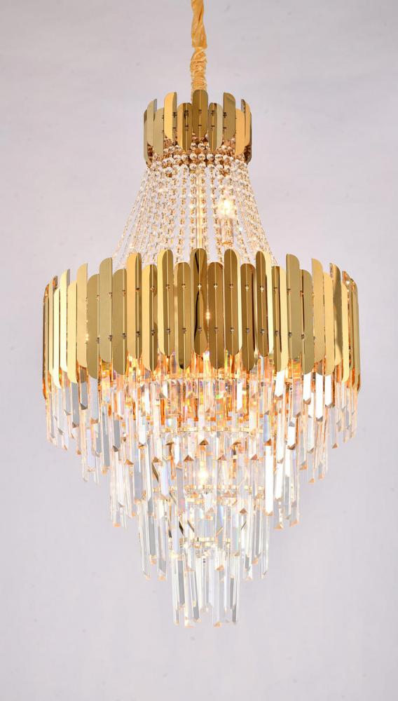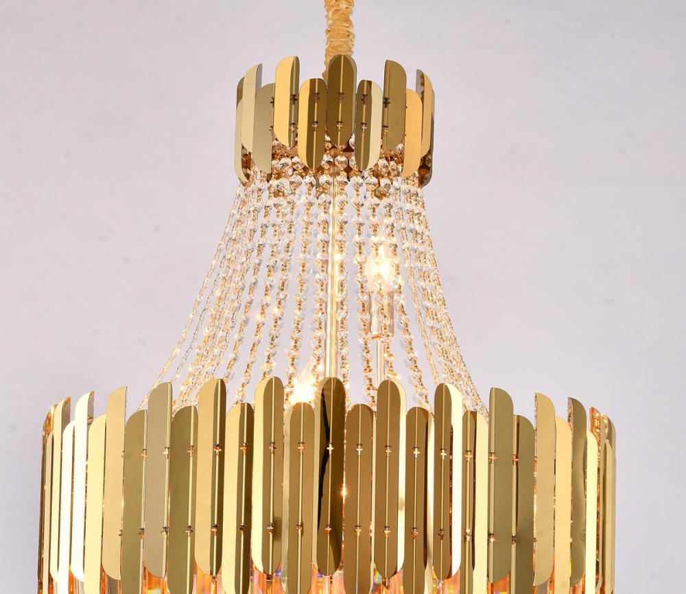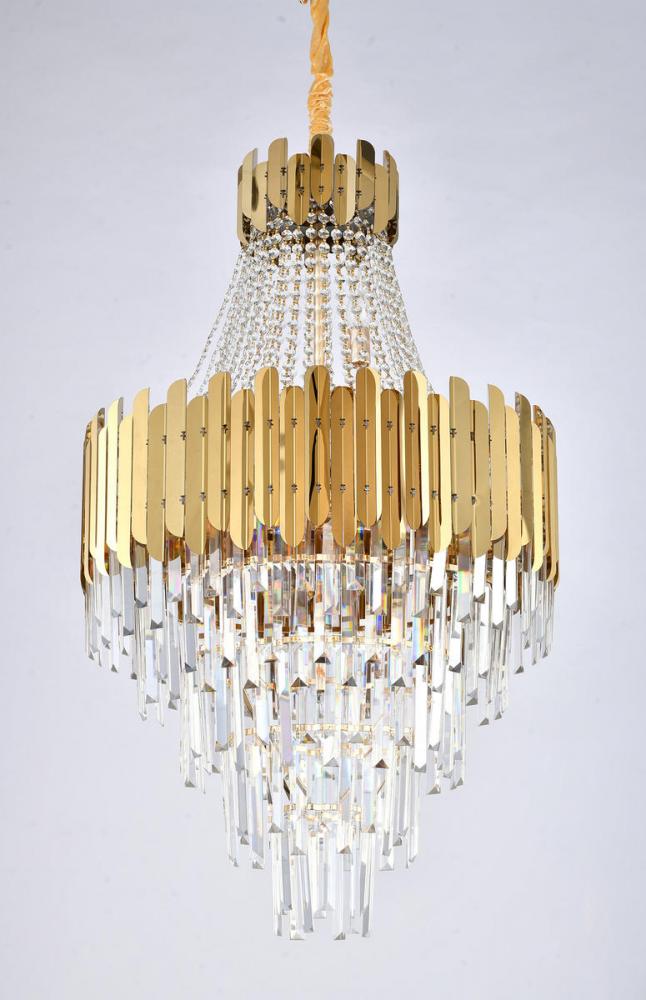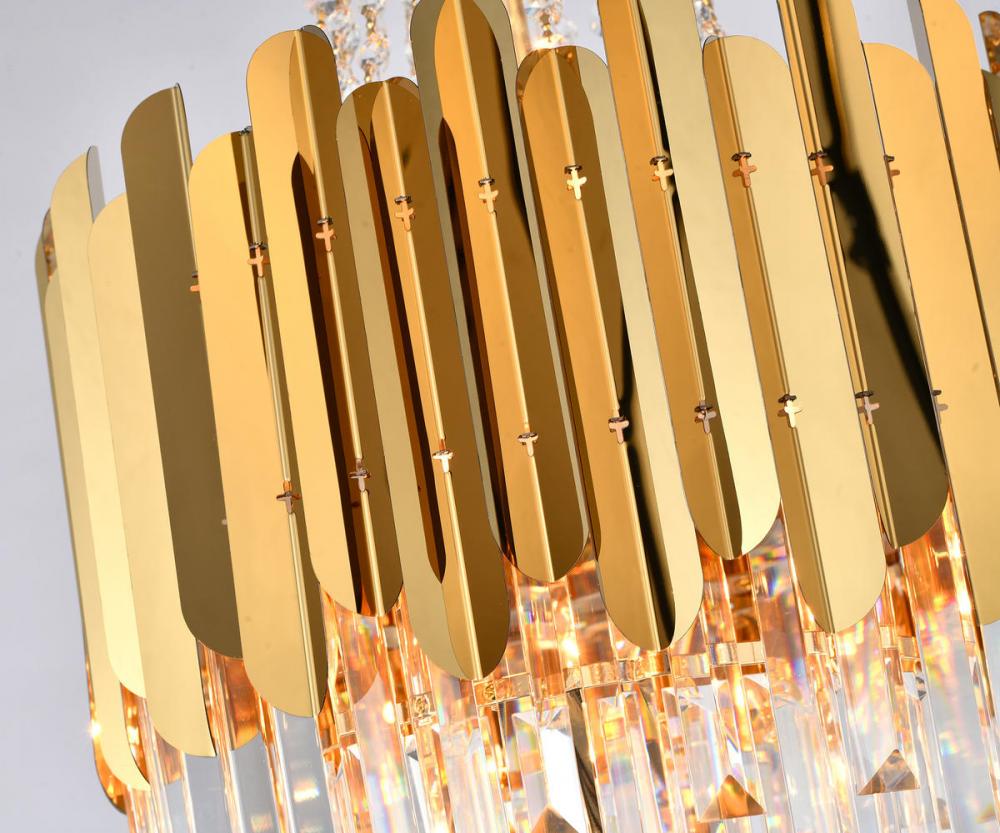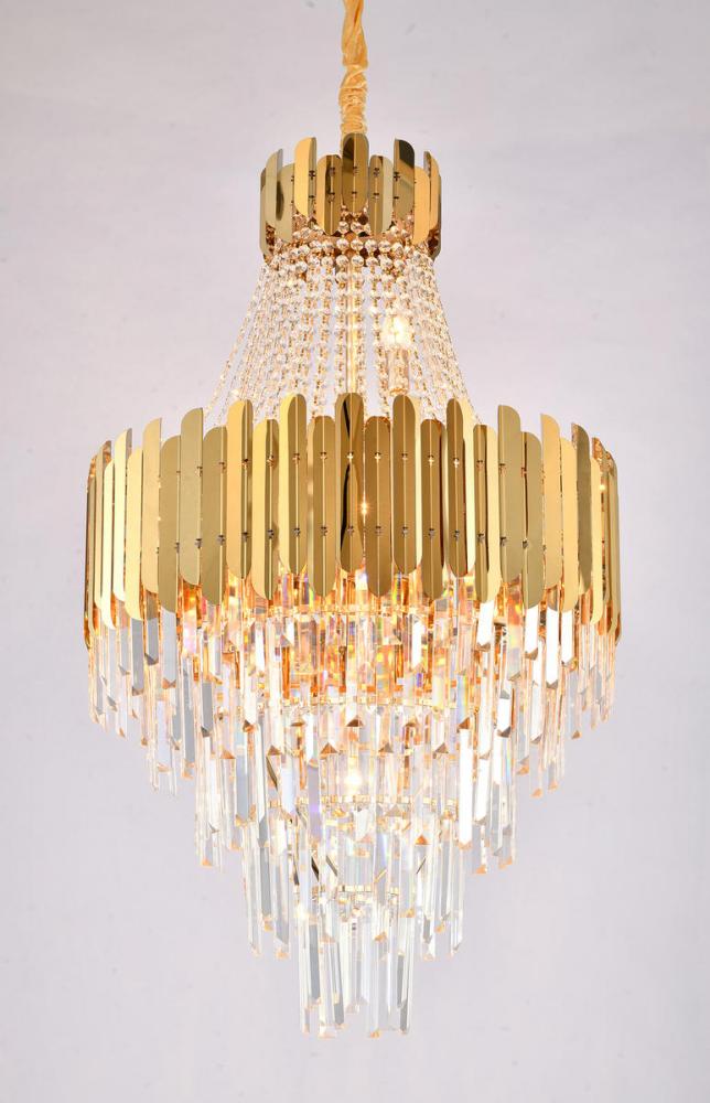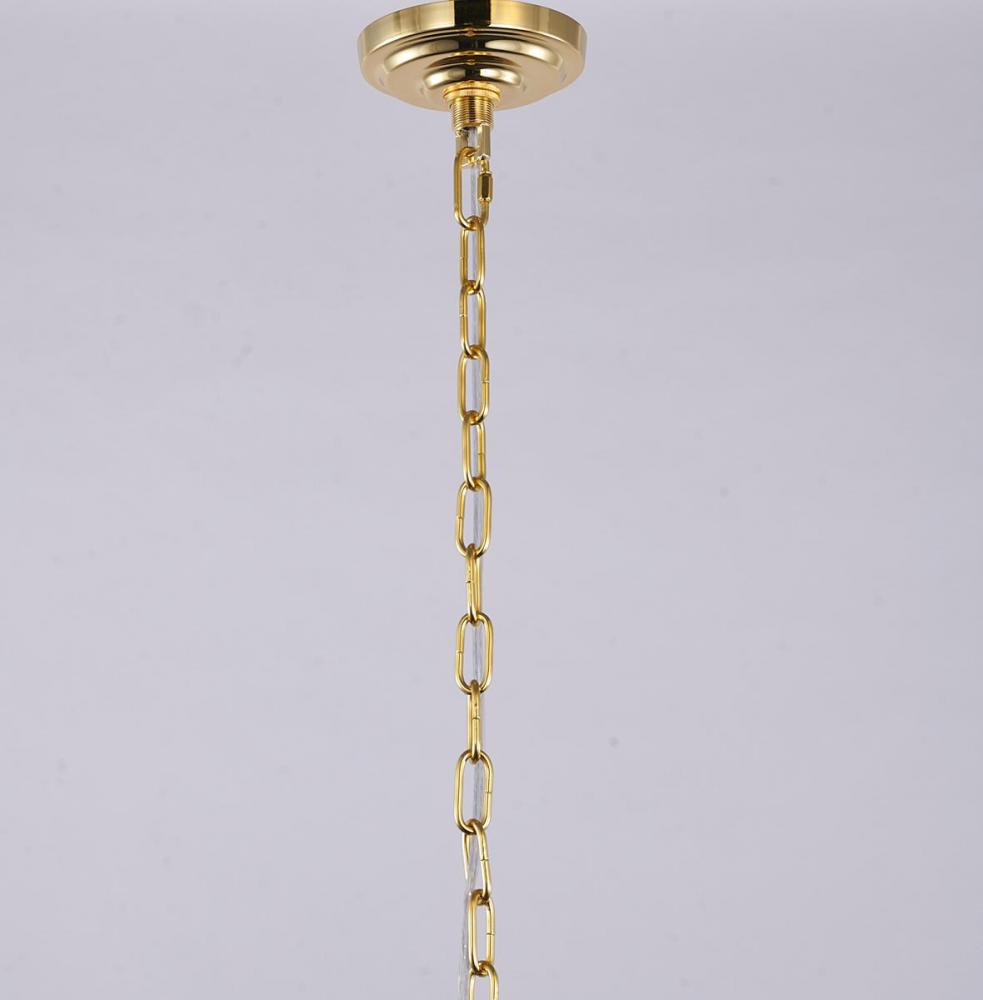 This exquisite chandelier is in a gold finish. The frame is made out of metal, and it comes with clear hanging crystals. The adjustable chain link makes this fixture suitable for most ceiling heights.