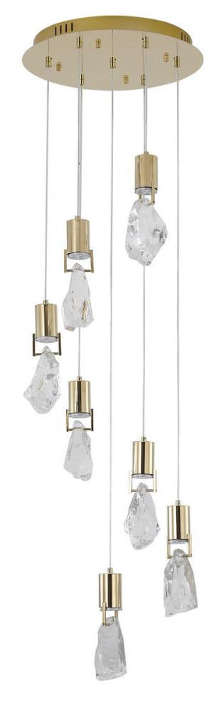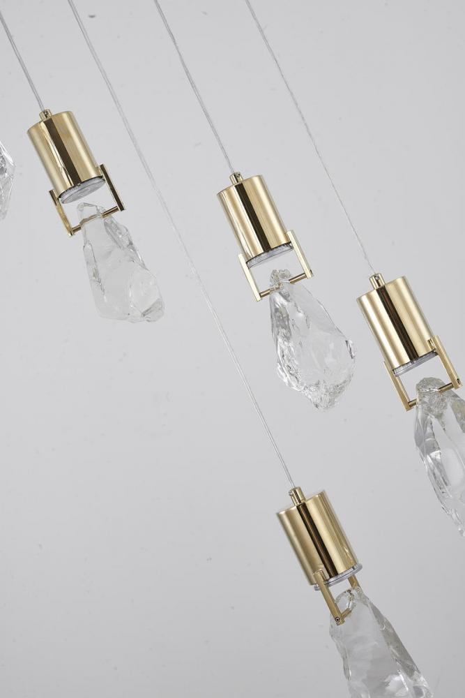 This exquisite chandelier in a brushed gold finish. The frame is made out of stainless steel, and it comes with clear crystal stone pendants. The adjustable cord links make this fixture suitable for most ceiling heights.