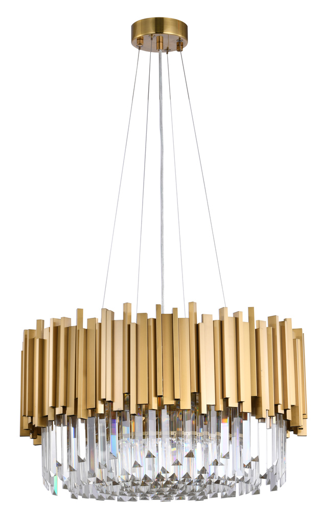 This exquisite chandelier is in a gold finish. The frame is made out of stainless steel, and it comes with clear hanging crystal accents. The adjustable cord links make this fixture suitable for most ceiling heights.