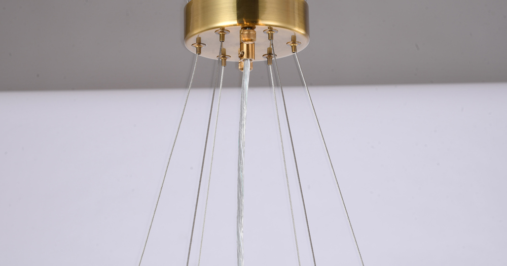 This exquisite chandelier is in a gold finish. The frame is made out of stainless steel, and it comes with clear hanging crystal accents. The adjustable cord links make this fixture suitable for most ceiling heights.