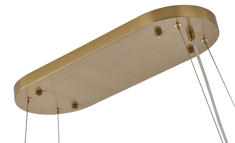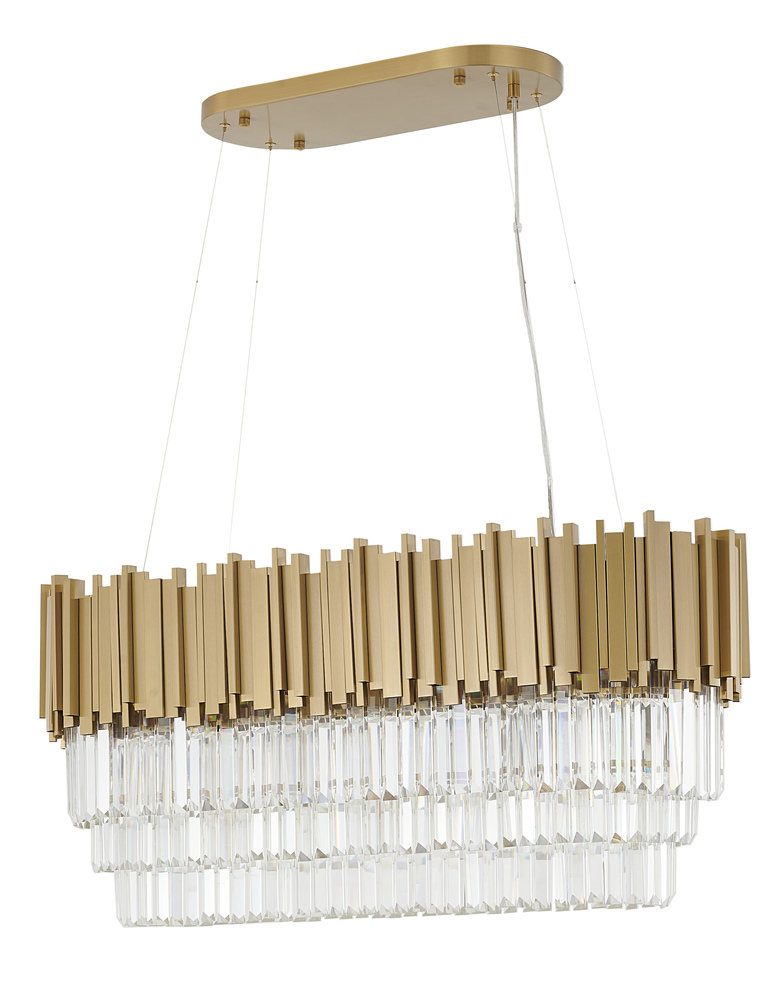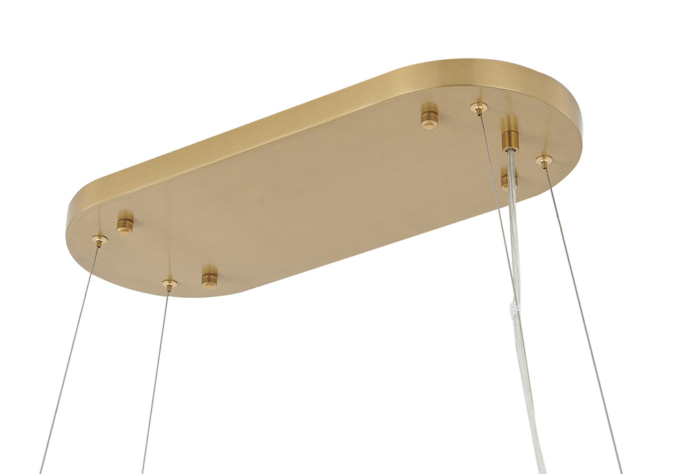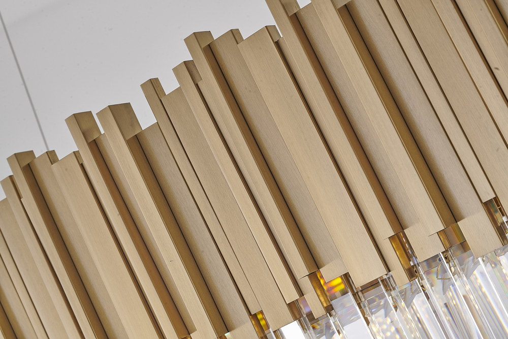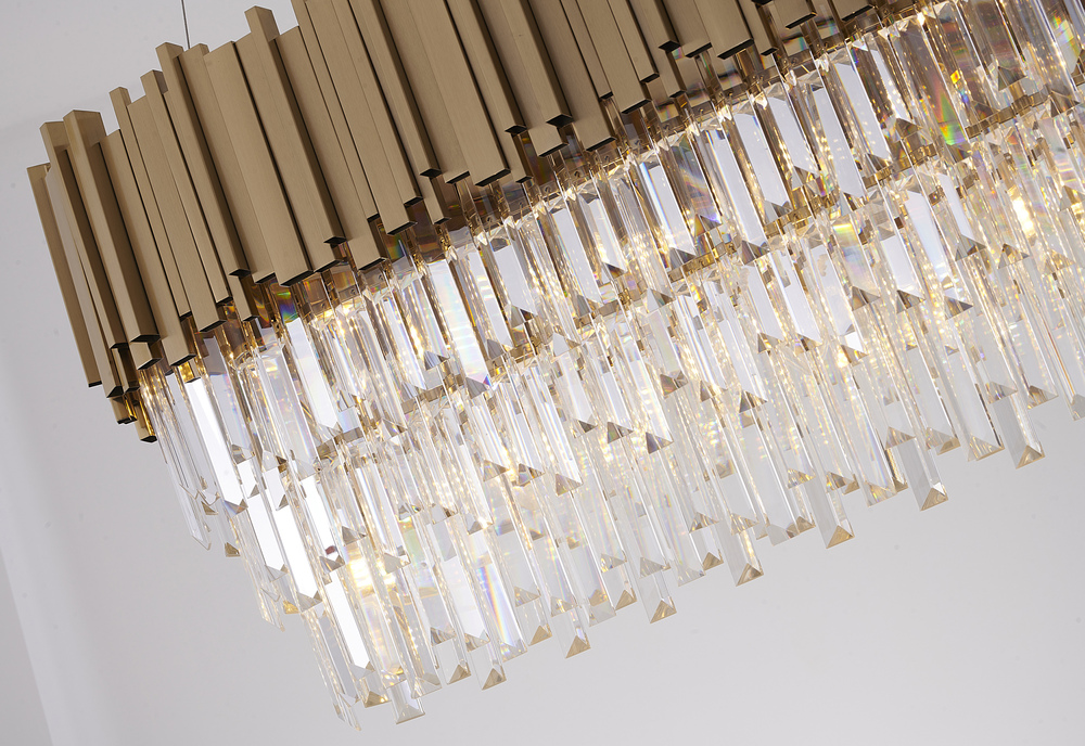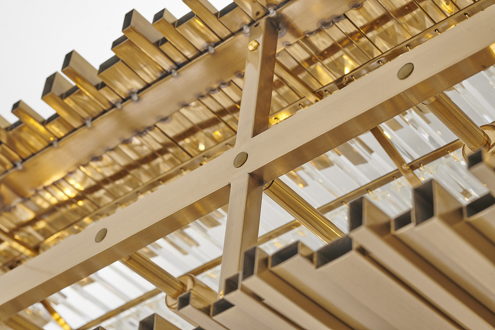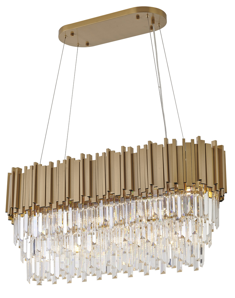 This exquisite chandelier is in a gold finish. The frame is made out of stainless steel, and it comes with clear crystal accents. The adjustable cord links make this fixture suitable for most ceiling heights.
