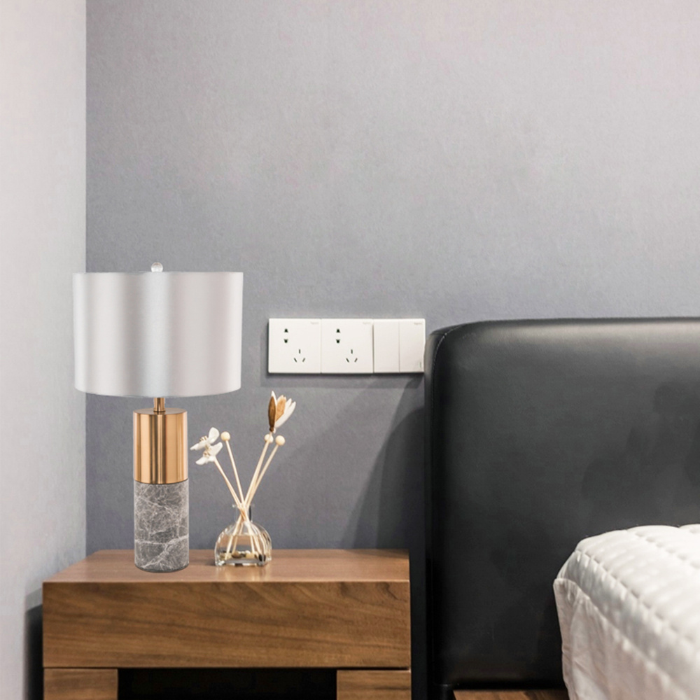 This table lamp is a gold table lamp. It comes with a grey marble base and a drum shade. The assembly is required for this table lamp.