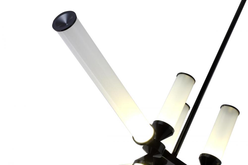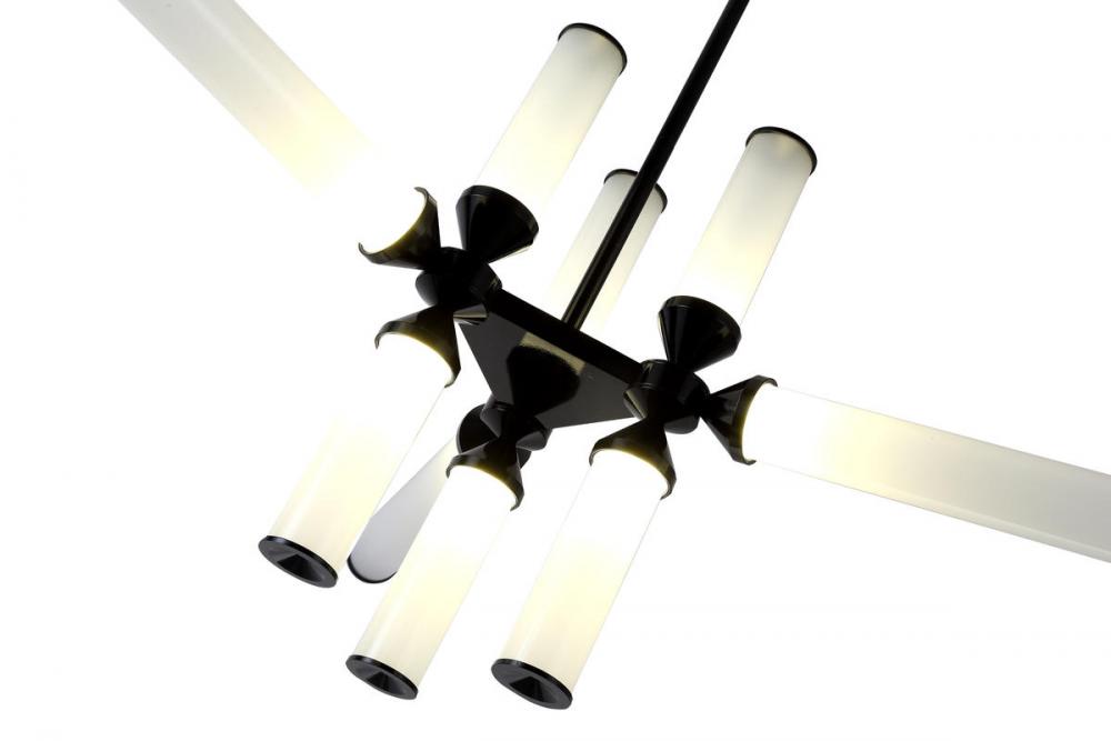 This exquisite LED chandelier is in a black finish. The frame is made out of aluminum, and it comes with white glass shades. The LED bulbs are integrated into the frame. The adjustable rod link makes this fixture suitable for most ceiling heights.