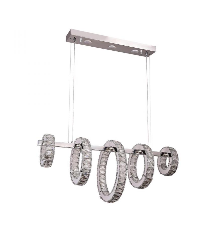 This exquisite LED lighting is in a chrome finish. The frame is made out of metal. It has five ORB LED rings with clear crystal accents, and LED bulbs are integrated into the rings. The LED color temperature can be changed to 3000K, 4500K, or 6000K