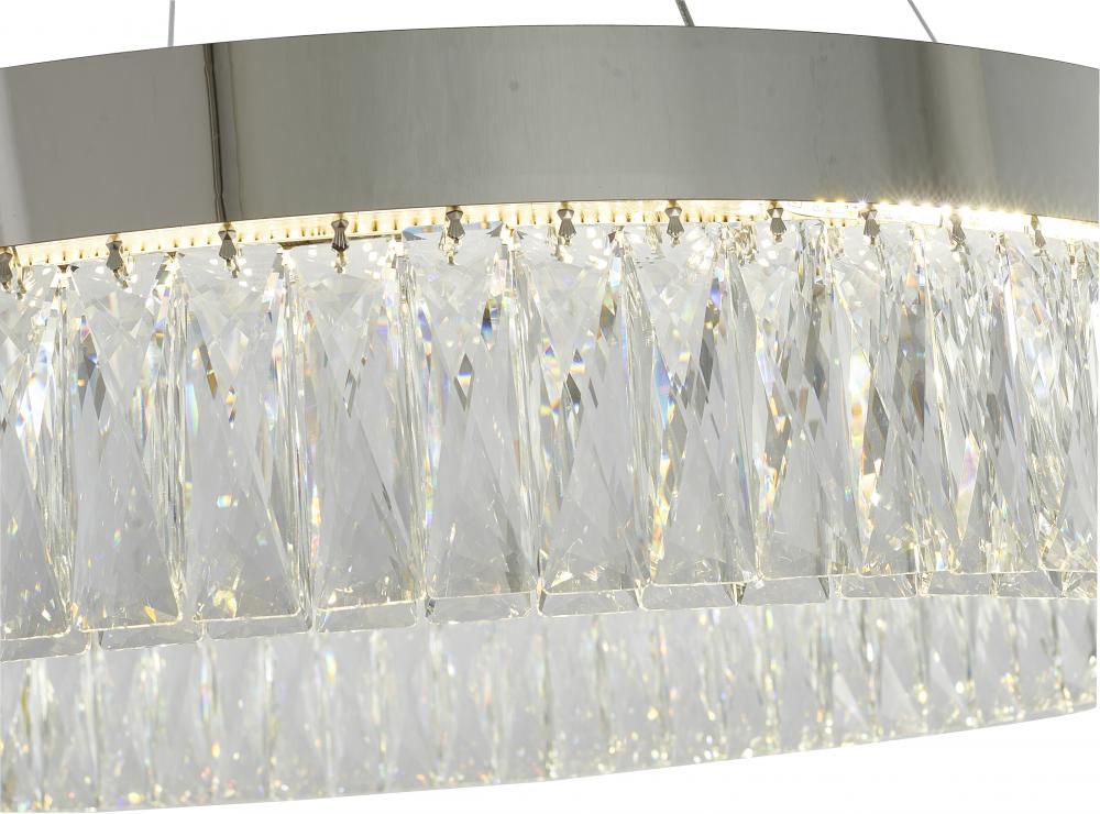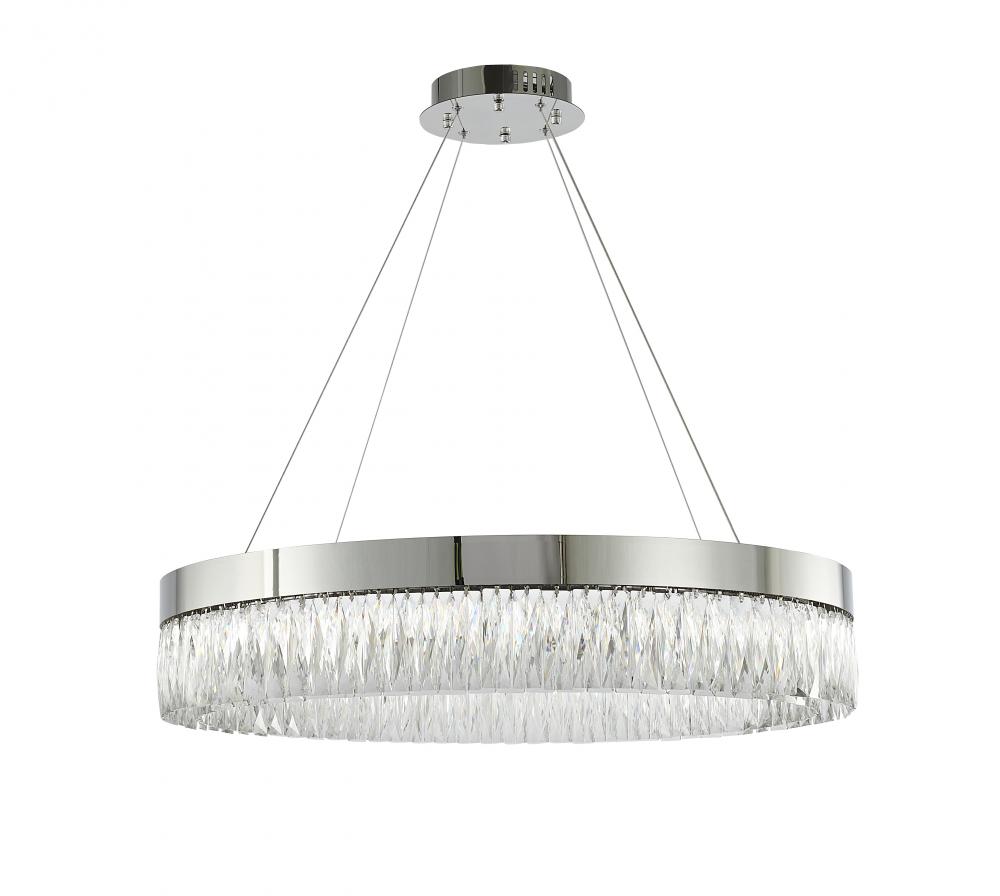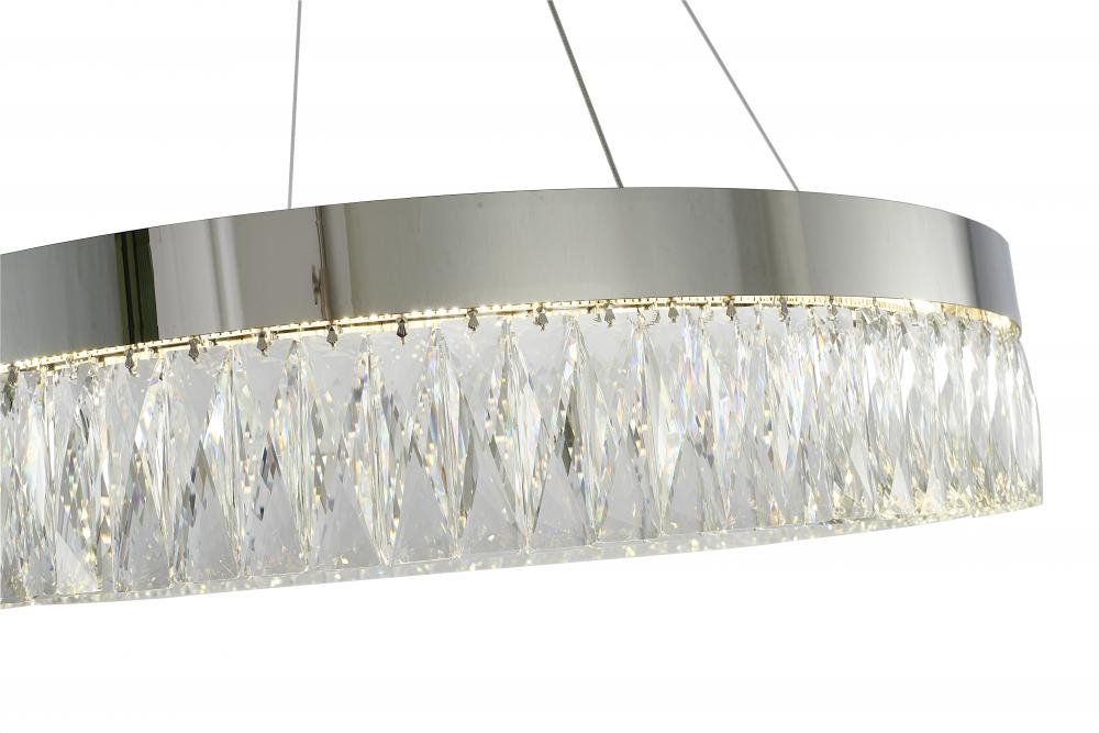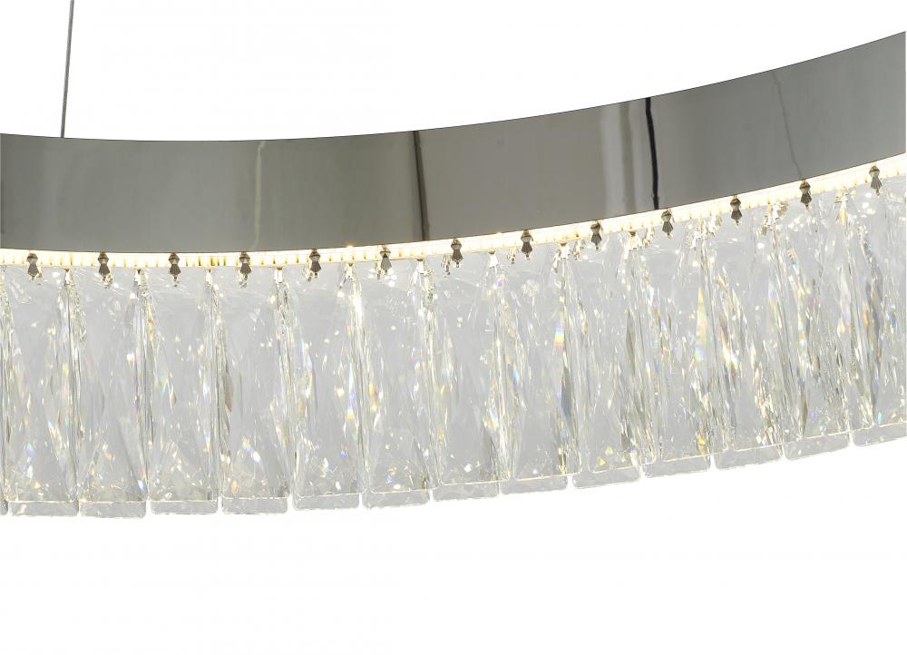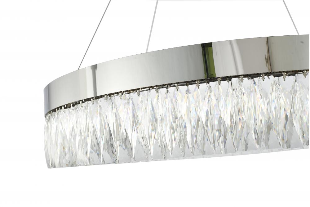 This chandelier is a round chrome frame LED chandelier. It comes with clear hanging crystals. The cord length of 59 inches is provided and the cord length is adjustable.