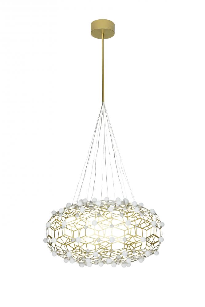 This chandelier is a gold honey comb stainless steel frame LED light fixture. It comes with white acrylic diffuser bulbs. The cord length of 2 meters is provided and the cord length is adjustable.