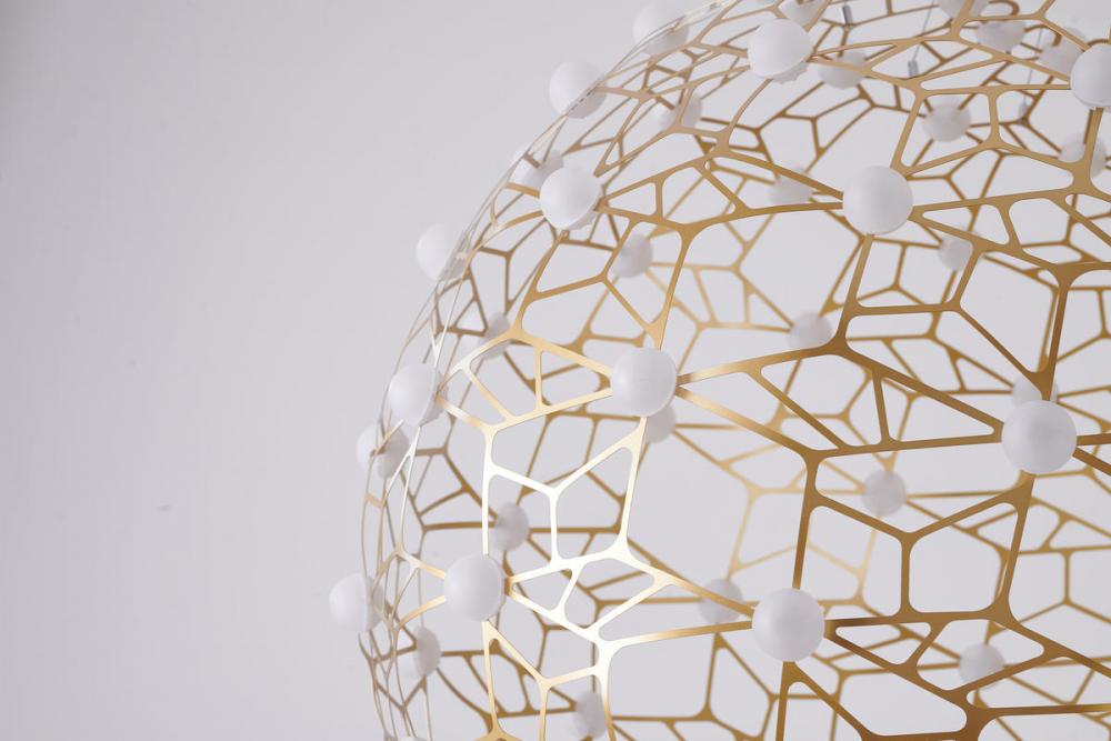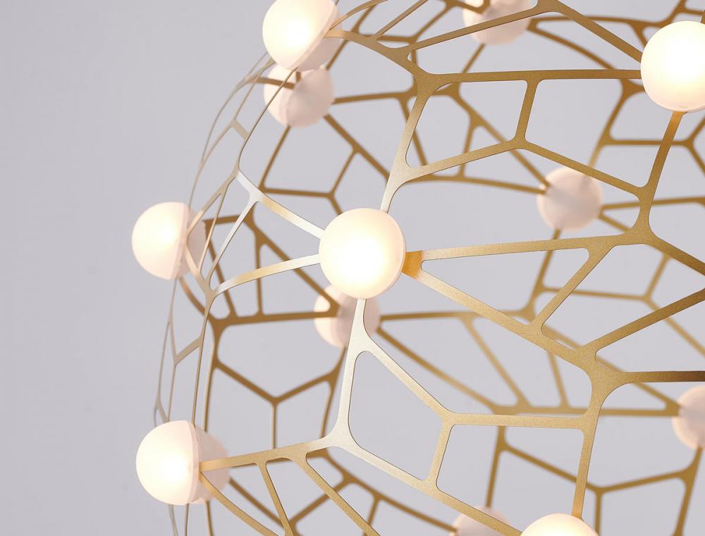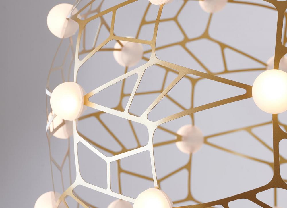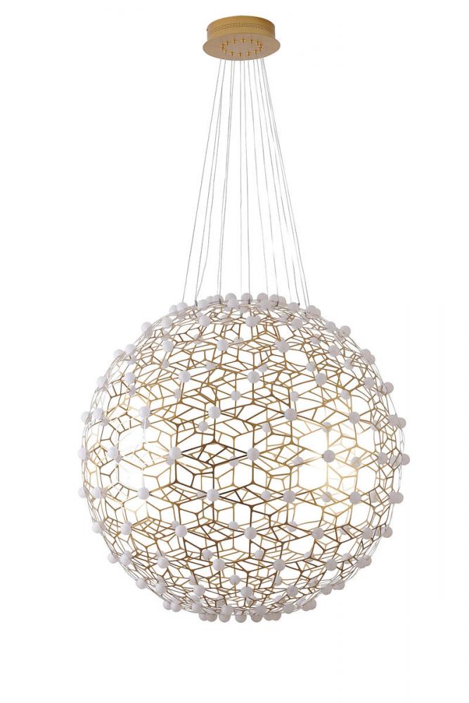 This exquisite LED chandelier is in a gold finish. The frame is made out of iron in an orb honeycomb shape. The LED bulbs are integrated into the frame. It comes with white acrylic diffusers. The adjustable cord links make this fixture suitable for most ceiling heights.