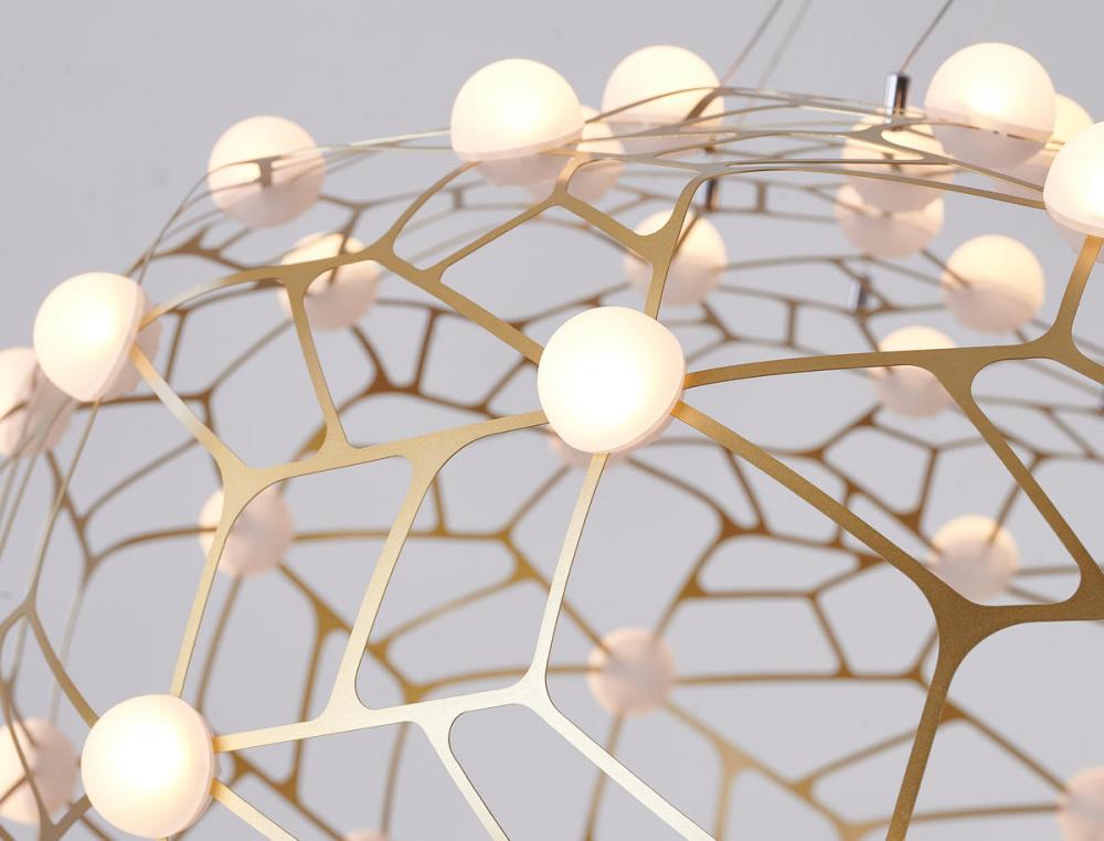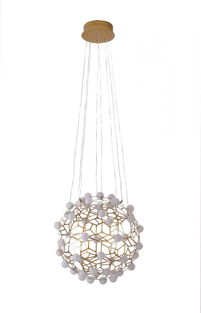 This exquisite LED chandelier is in a gold finish. The frame is made out of iron in a honeycomb orb shape. The LED bulbs are integrated into the frame. It comes with white acrylic diffusers. The adjustable cord links make this fixture suitable for most ceiling heights.