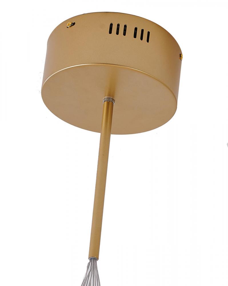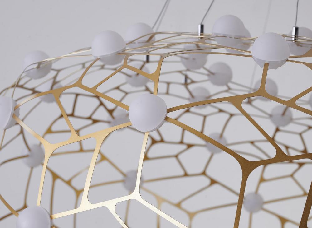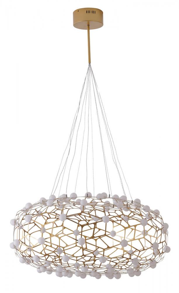 This exquisite LED chandelier is in a gold finish. The frame is made out of iron in an oval honeycomb shape. The LED bulbs are integrated into the frame. It comes with white acrylic diffusers. The adjustable cord links make this fixture suitable for most ceiling heights.