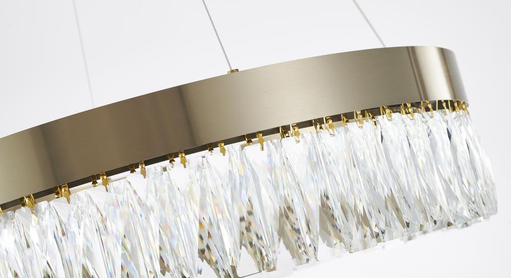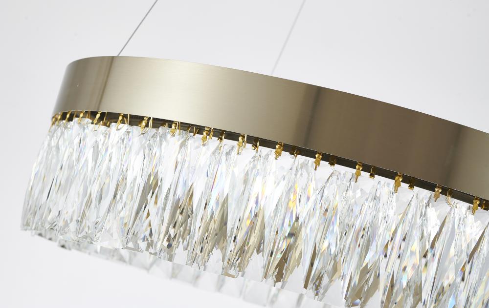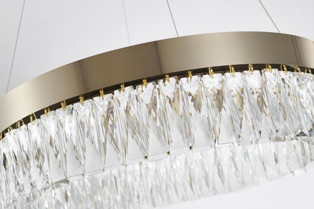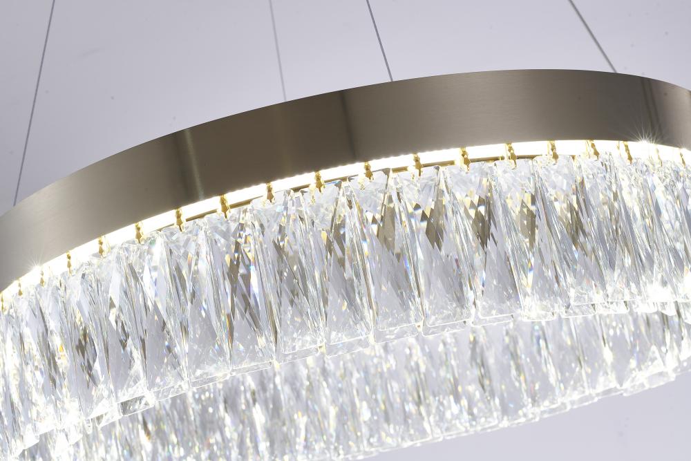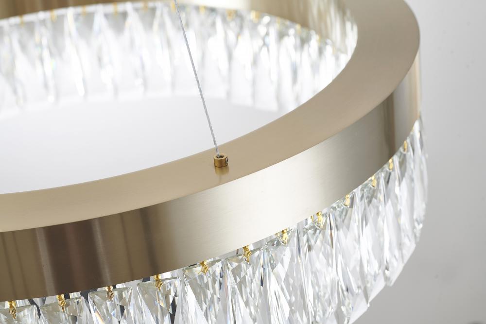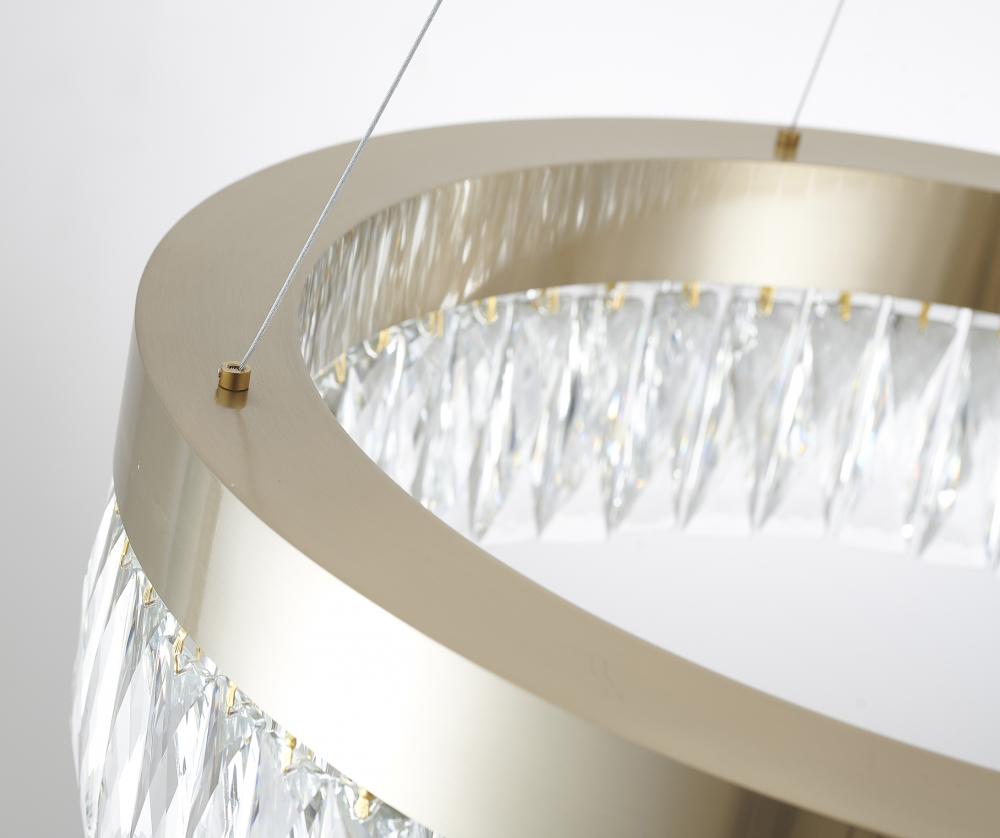 This chandelier is a gold hairline frame LED chandelier. It comes with clear hanging crystals. This chandelier can change up to 3 LED color temperatures which are 3000K, 4000K and 5000K.