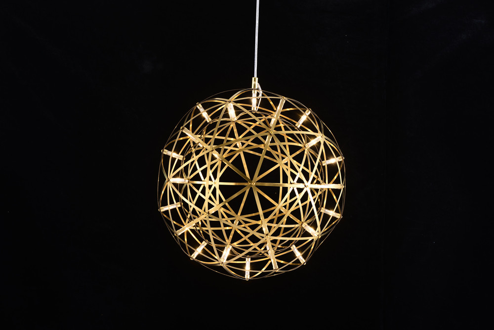This globe LED lighting fixture is in a gold finish. The frame is made out of stainless steel and there are forty-two LED lights on the frame. This is fixture can be used in any room, entryways and more.
