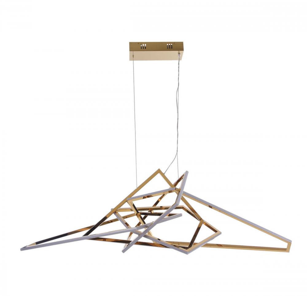 This dimmable LED lighting is has a gold stainless steel frame in an abstract shape. The LED bulbs are integrated into the frame. The adjustable cord links make this fixture suitable for most ceiling heights.