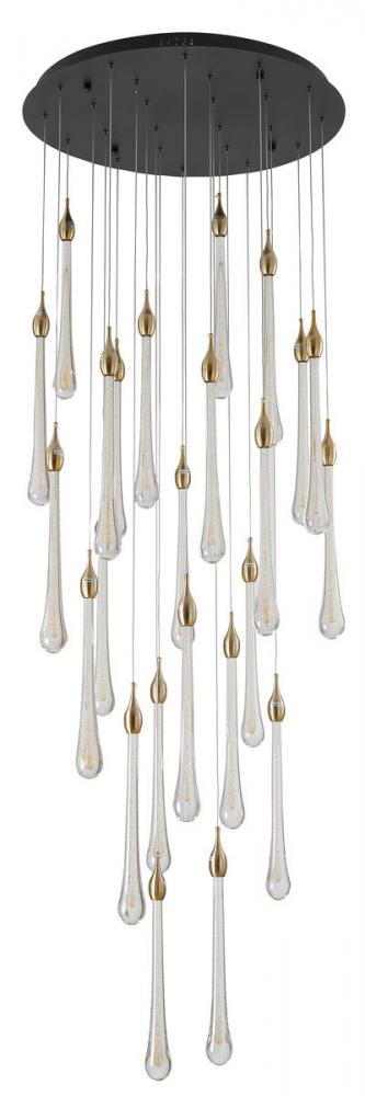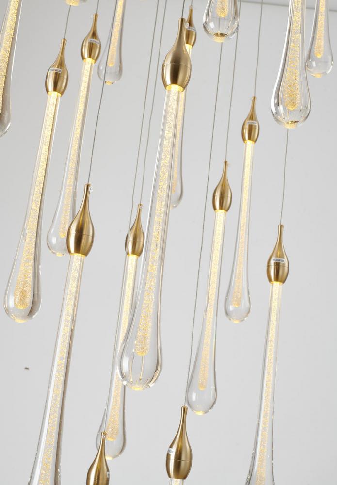 This modern LED lighting has a gold metal frame and dusted glass hanging pendants