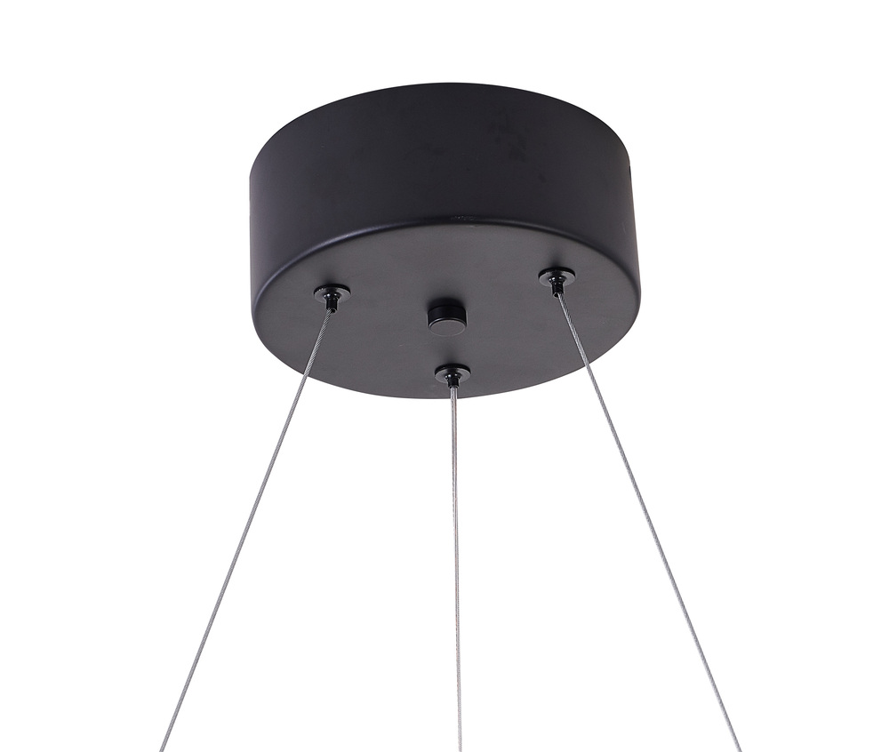 This exquisite LED chandelier is in a matte black finish. The frame is made out of iron in a halo ring shape, and the LED bulbs are integrated into the frame. It comes with a white acrylic diffuser.