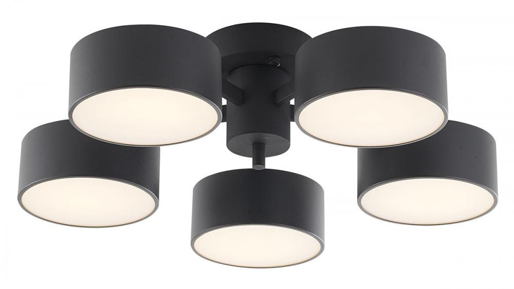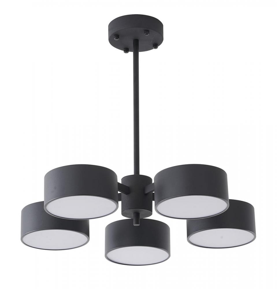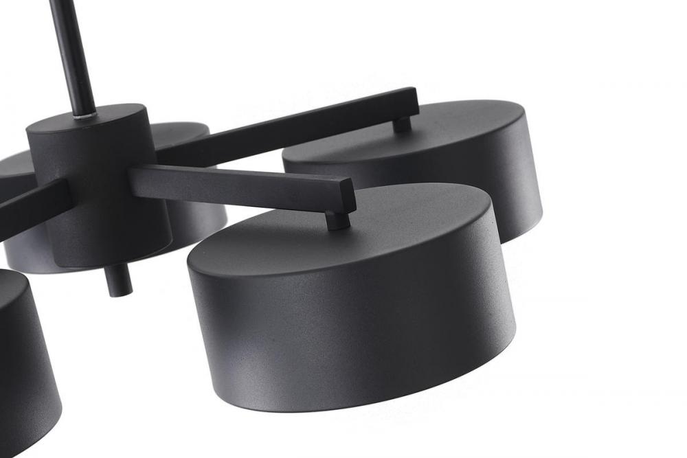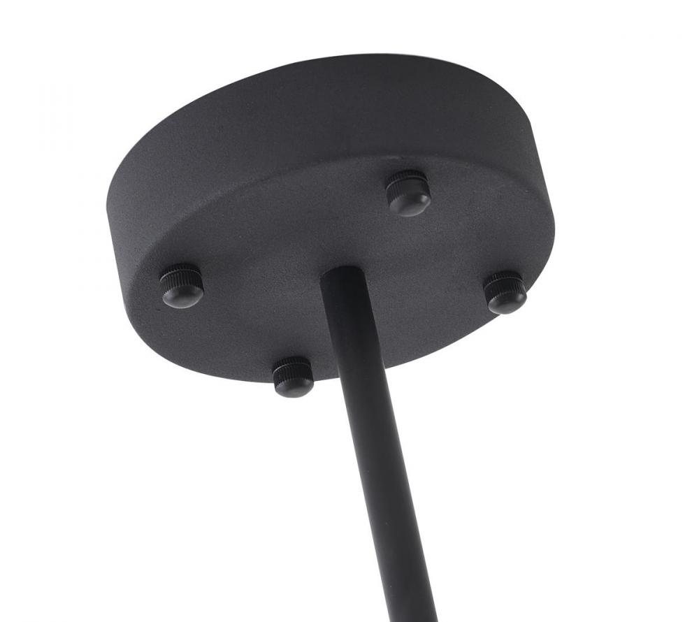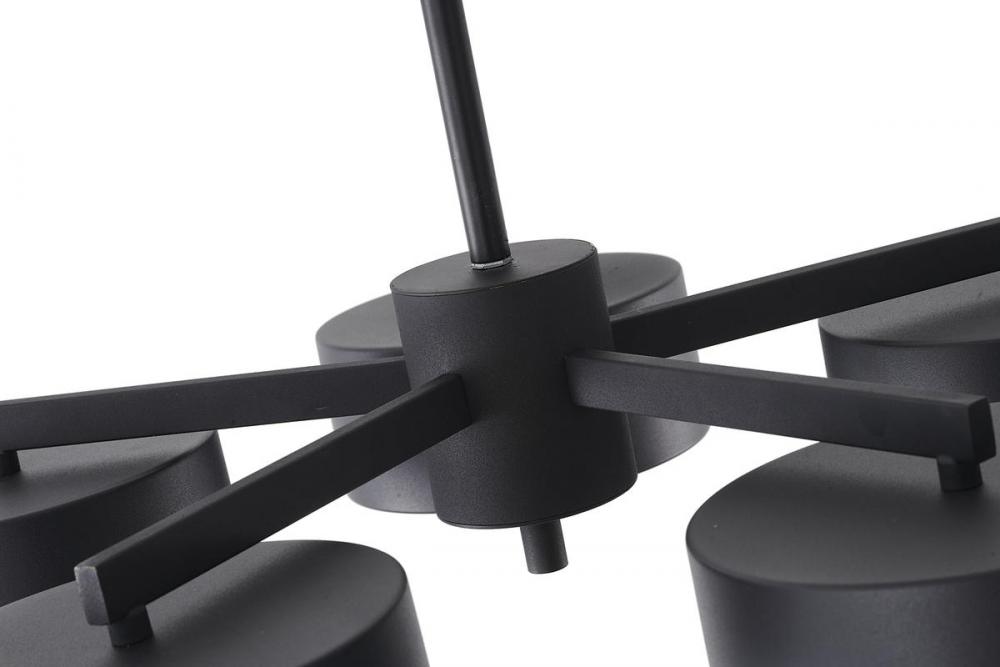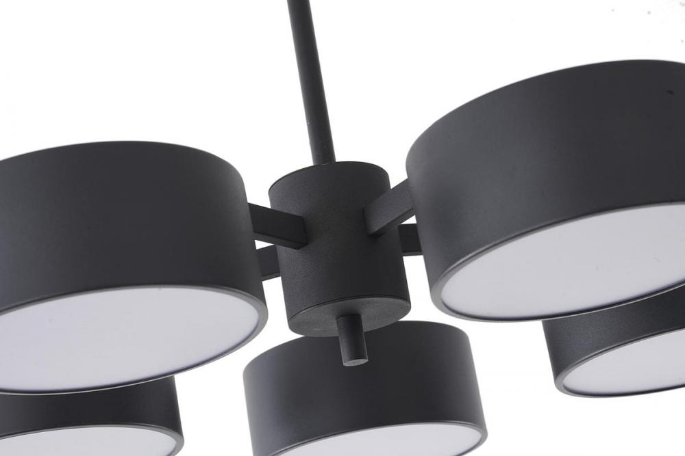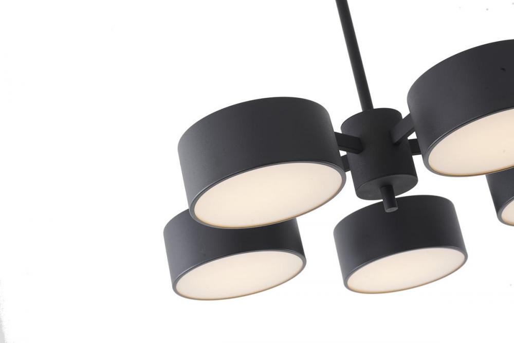This exquisite LED chandelier has a black metal frame. It comes with black metal shades with white frosted diffusers, and the LED bulbs are integrated into the frame. The adjustable rod link makes this fixture suitable for most ceiling heights.