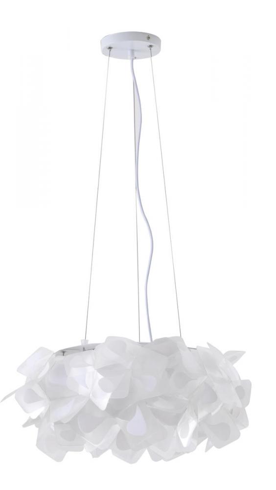 This unique LED chandelier is in a white finish. The frame is made out of metal, and the LED bulb is integrated into the frame. It comes with a white acrylic shade in an abstract cloud shade. The adjustable cord links make this fixture suitable for most ceiling heights.