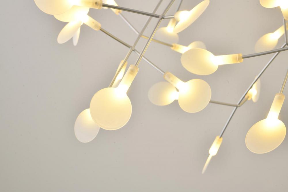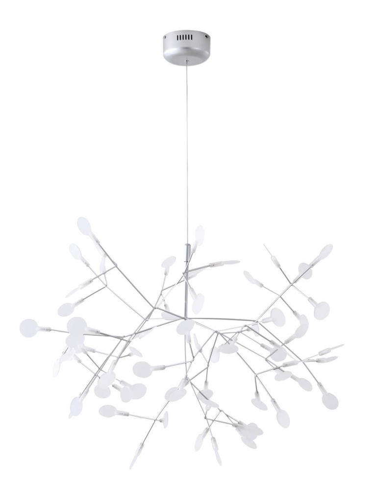 This exquisite LED chandelier is in a silver finish. The frame is made out of metal, and it comes with frosted acrylic diffusers. The LED bulbs are integrated into the frame. The adjustable cord link makes this fixture suitable for most ceiling heights.