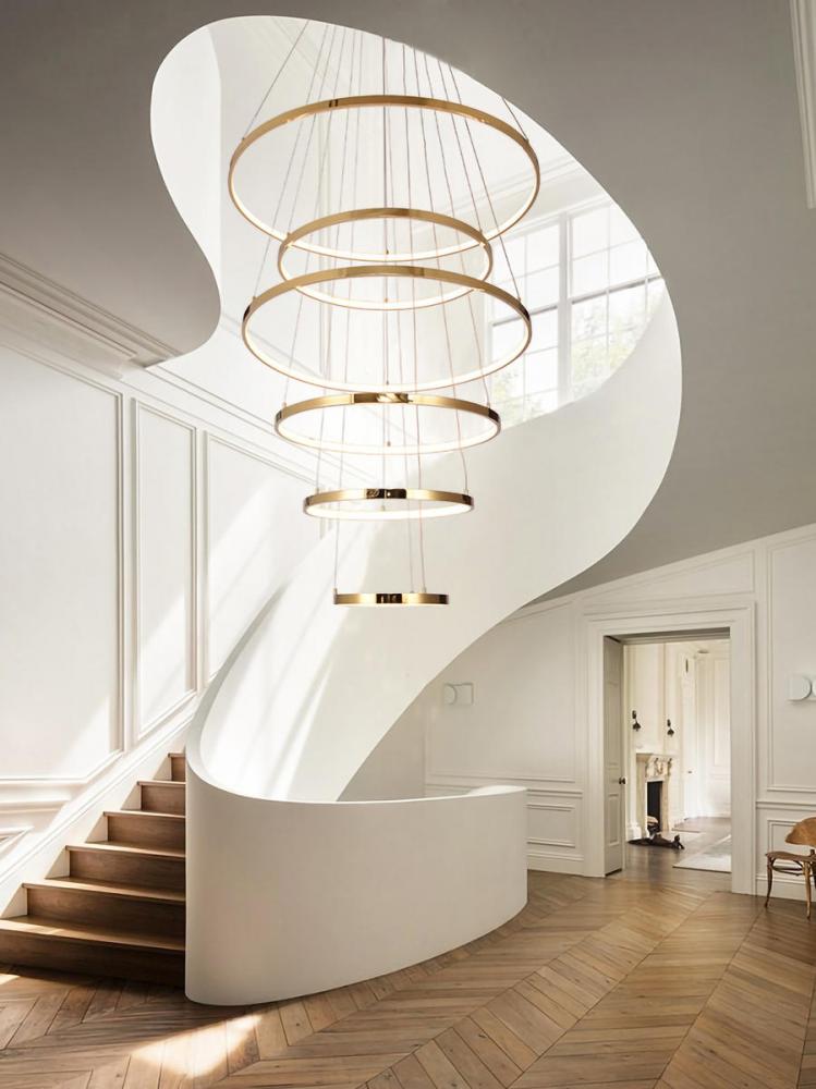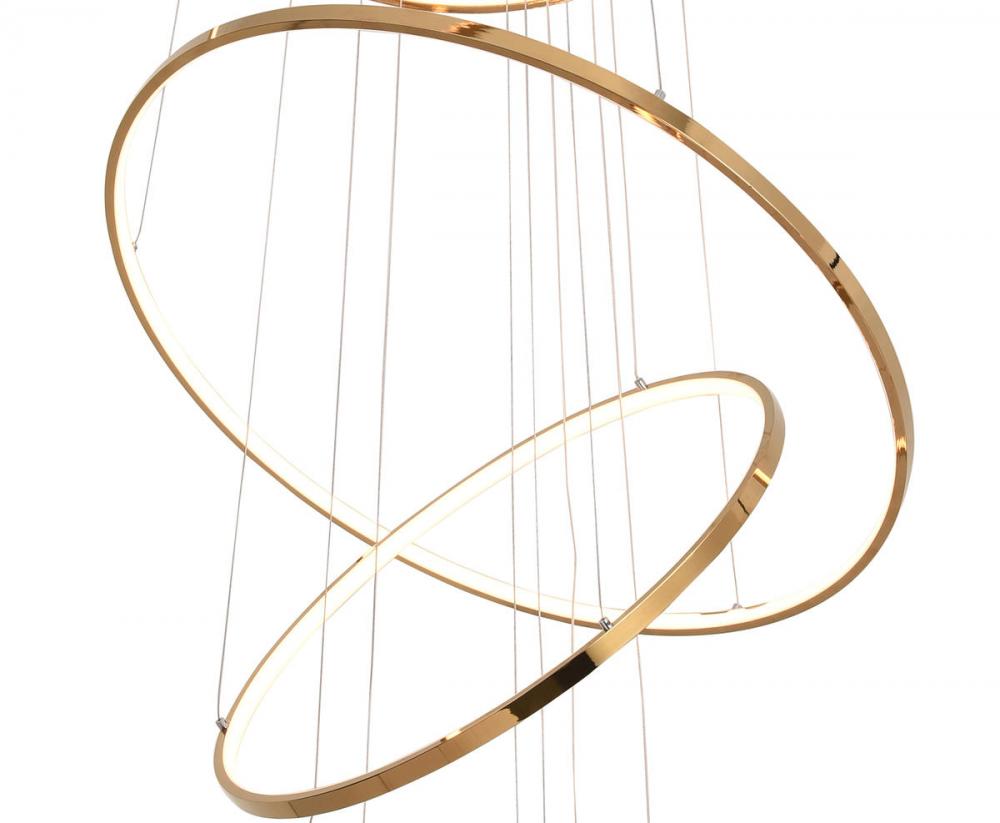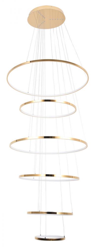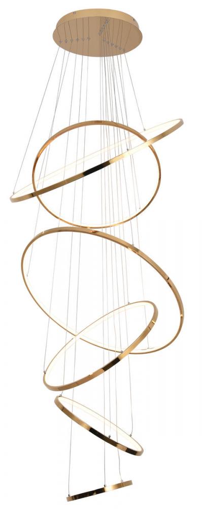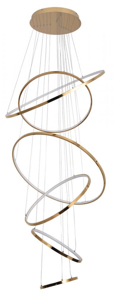 This exquisite LED chandelier is in a gold finish. The frame is made out of metal, and it comes with white acrylic diffusers. The LED bulbs are integrated into the frame. You can create a timeless feel while using modern forms.