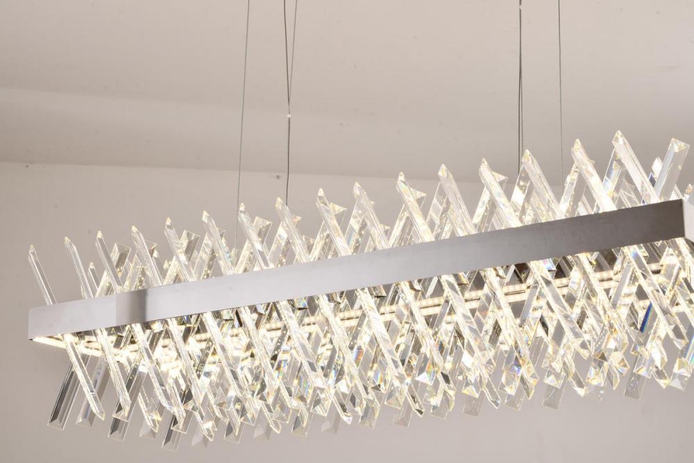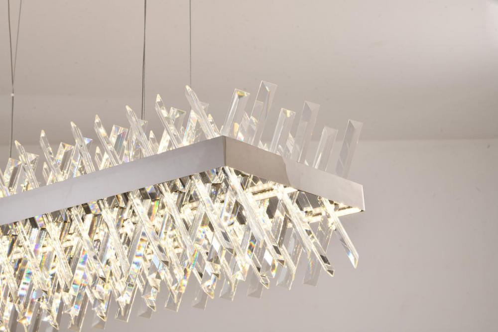 This dimmable LED chandelier is in a chrome finish. The frame is made out of metal in a rectangular shape, and it comes with clear crystals. The LED bulbs are integrated into the frame. The adjustable cord links make this fixture suitable for most ceiling heights.
