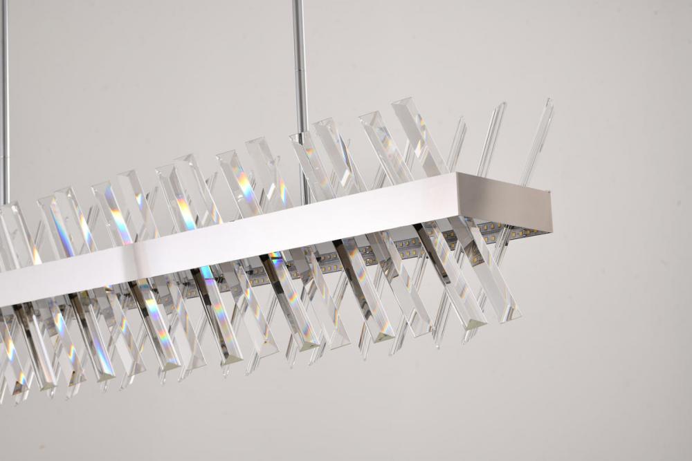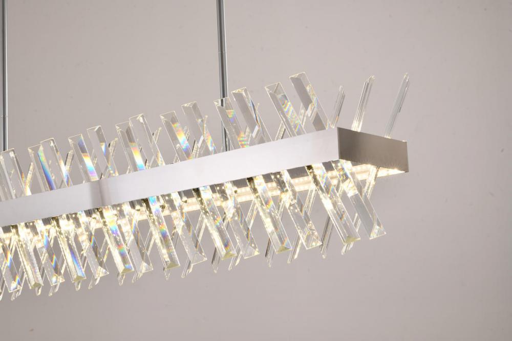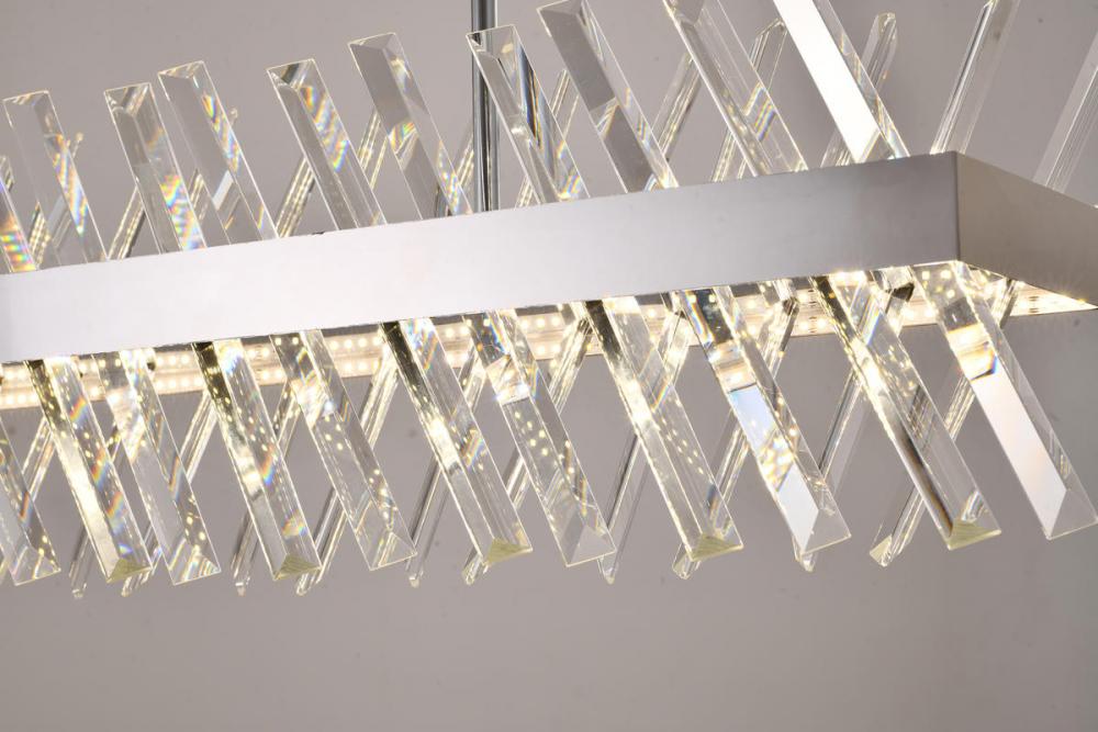 This dimmable LED chandelier is in a chrome finish. The frame is made out of metal in a rectangular shape, and it comes with clear crystals. The LED bulb is integrated into the frame. The adjustable rod links make this fixture suitable for most ceiling heights.