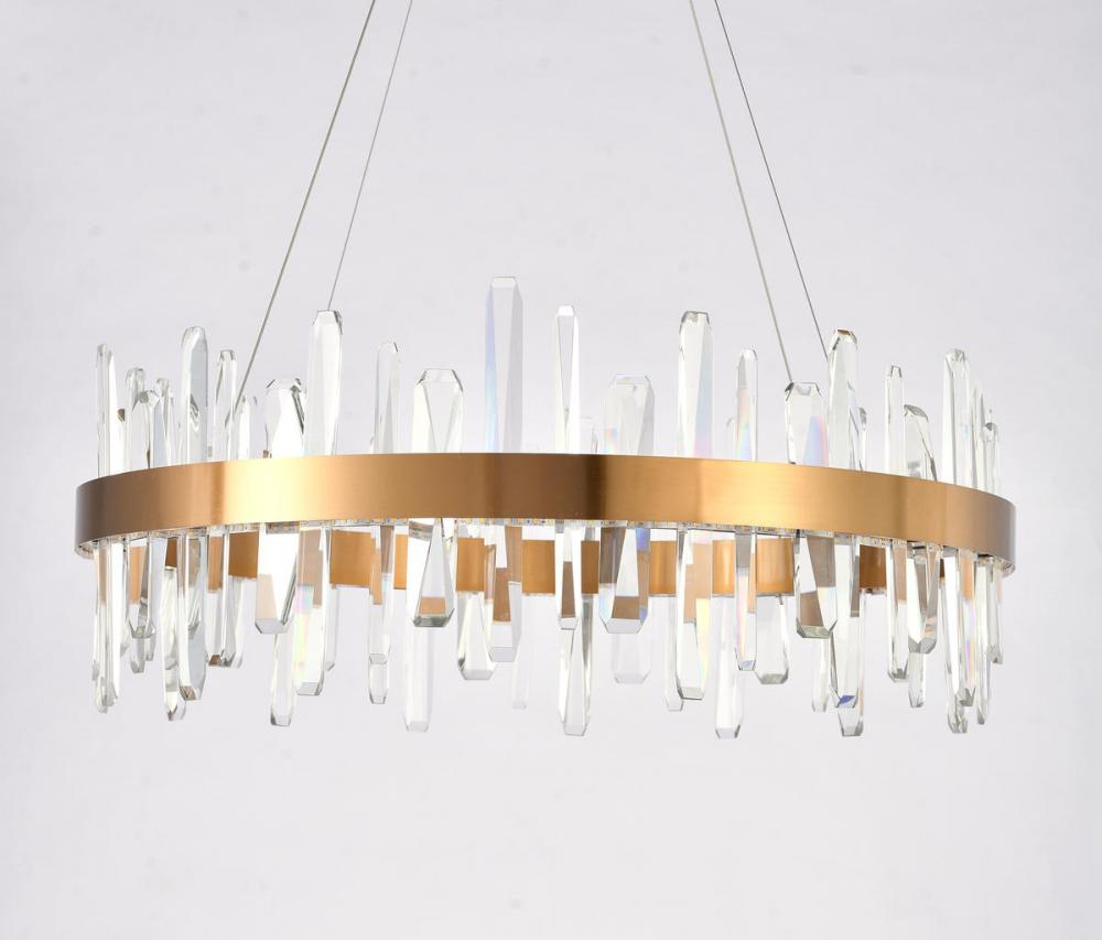 This exquisite LED chandelier is in a gold finish. The frame is made out of stainless steel, and the LED bulbs are integrated into the frame. It also comes with clear crystals. You can create a timeless feel while using modern forms.