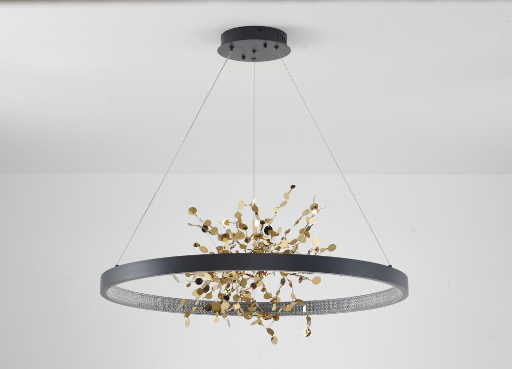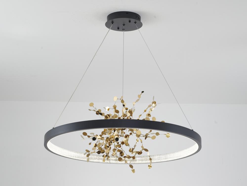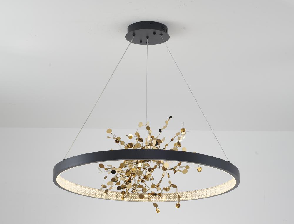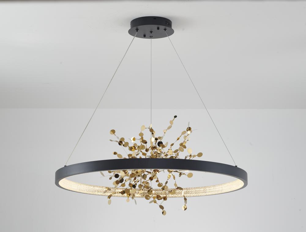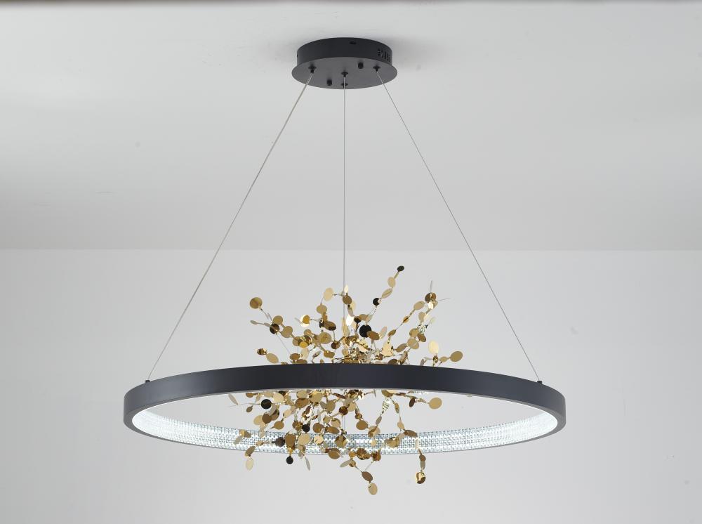 This chandelier is a sand black frame chandelier. It comes with a gold stainless steel confetti interior and a transparent diffuser. This chandelier can change to three LED color temperatures such as 3000K, 4000K and 6000K.