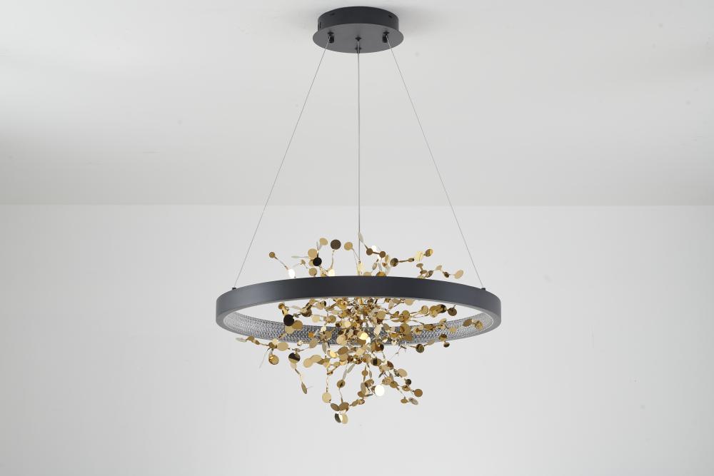 This chandelier is a sand black frame chandelier. It comes with a gold stainless steel confetti interior and a transparent diffuser. This chandelier can change to three LED color temperatures such as 3000K, 4000K and 6000K.