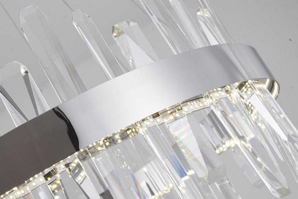 This exquisite LED chandelier is in a chrome finish. The frame is made out of stainless steel, and it comes with clear crystal accents. The LED bulbs are integrated into the frame. The adjustable cord links make this fixture suitable for most ceiling heights.