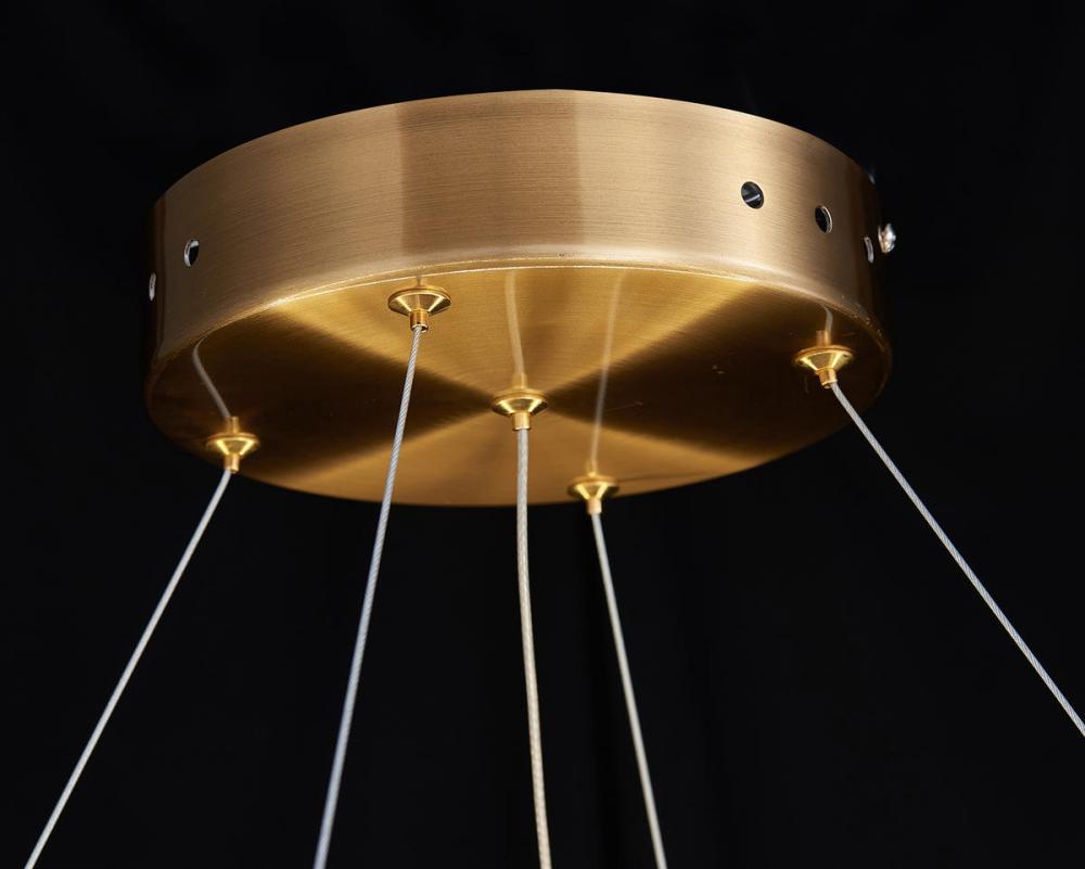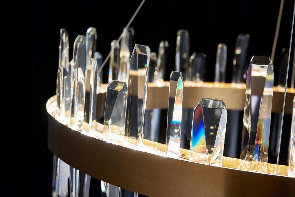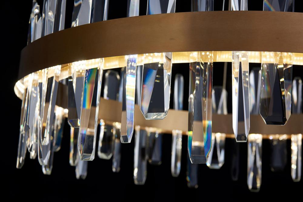 This exquisite LED chandelier is in a gold finish. The frame is made out of stainless steel, and the LED bulbs are integrated into the frame. It also comes with clear crystals. You can create a timeless feel while using modern forms.