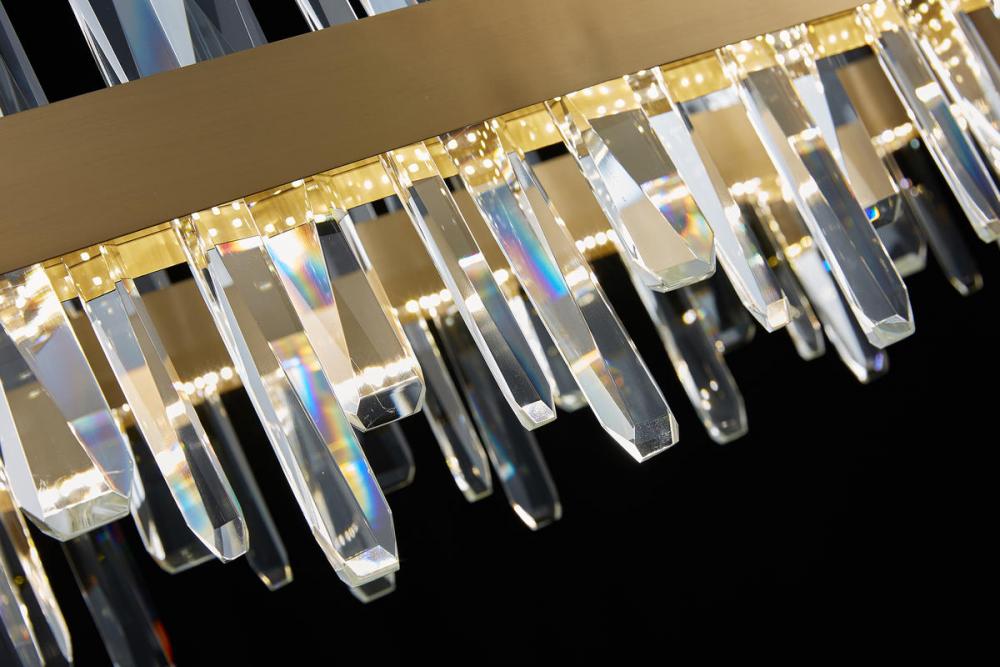 This exquisite LED chandelier is in a gold finish. The frame is made out of stainless steel in an oval shape, and the LED bulbs are integrated into the frame. It also comes with clear crystal accents. The adjustable cord links make this fixture suitable for most ceiling heights.