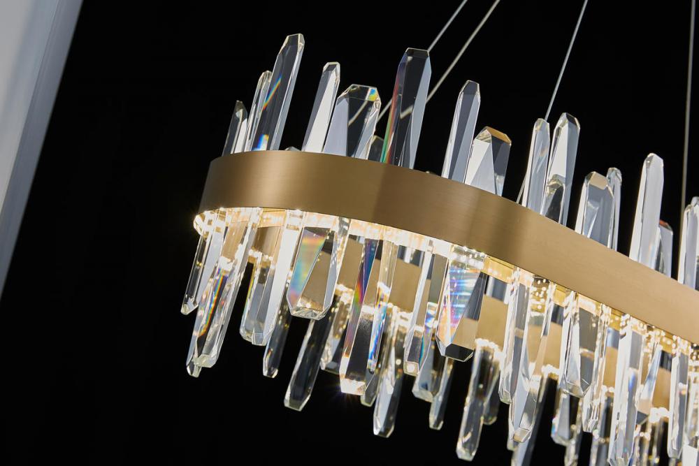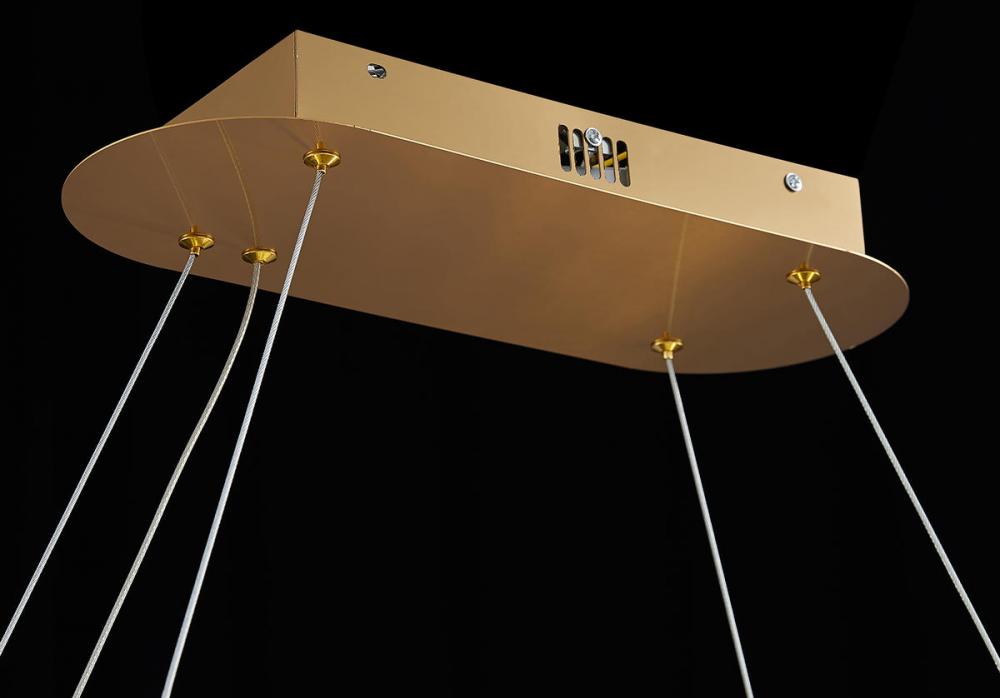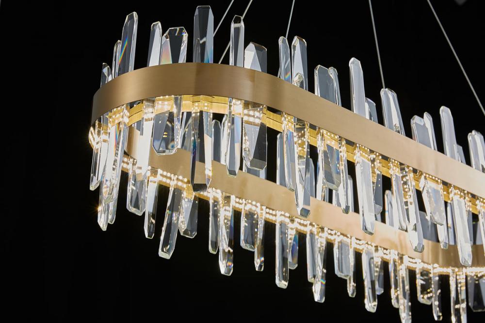 This LED chandelier has a gold stainless steel frame in an oval shape