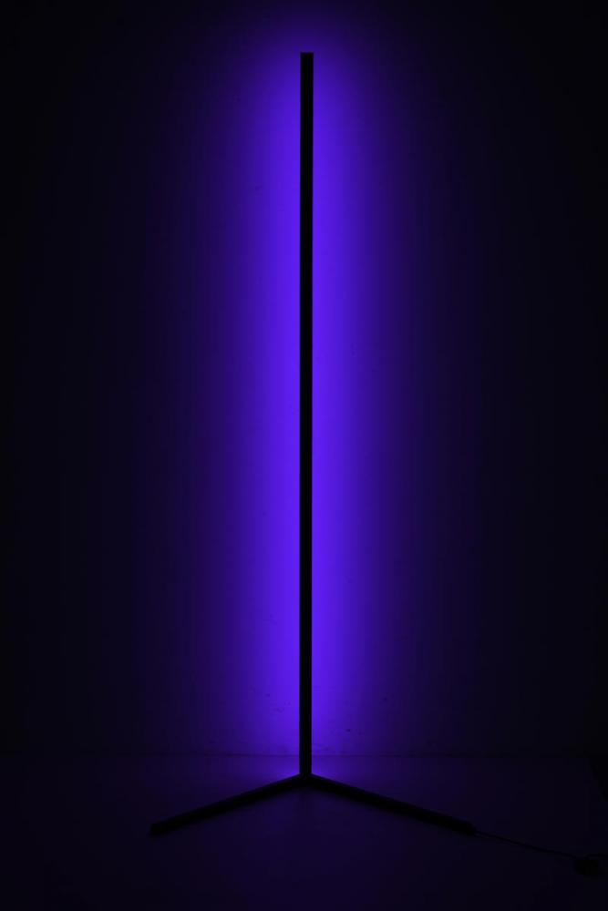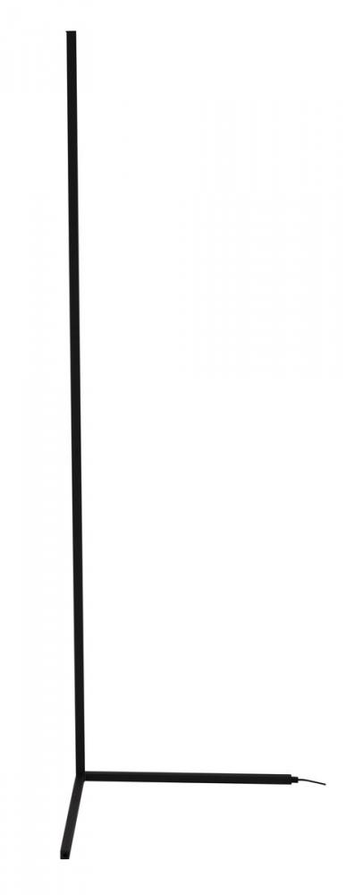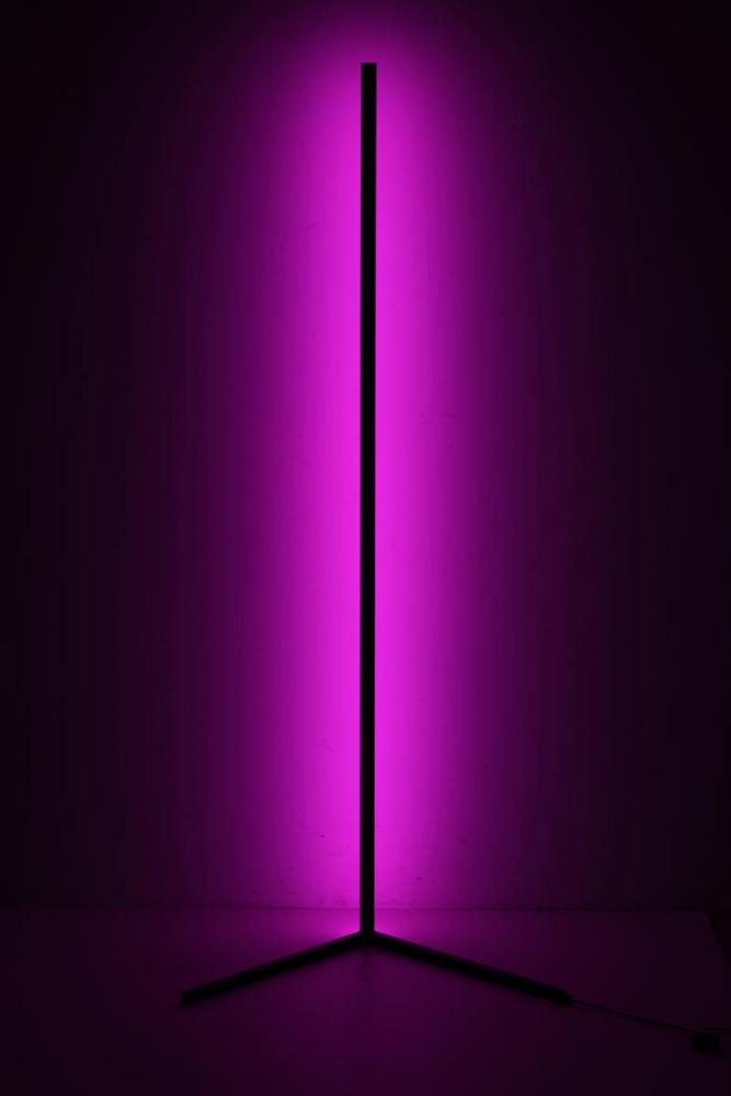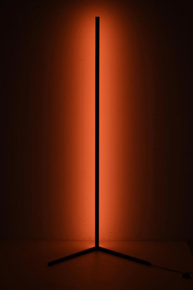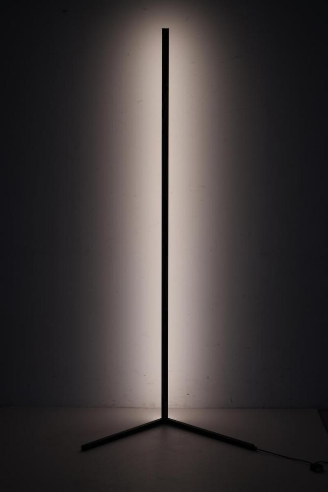 This dimmable LED floor lamp has a matte black iron and aluminum frame. The LED bulb is integrated into the frame with color change options. It can be controlled by remote or phone APP.