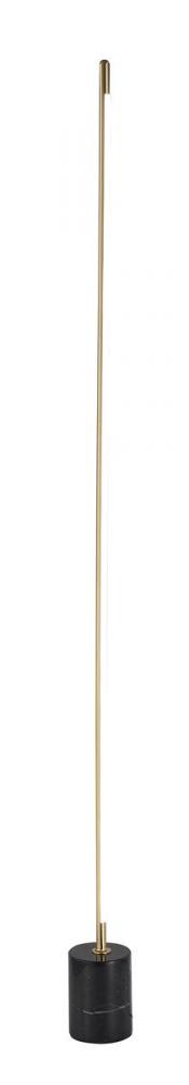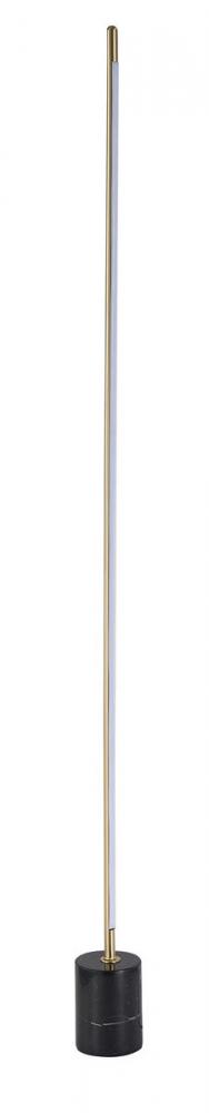 This LED floor lamp is in a brass and black finish. The frame is made out of stainless steel, and the LED bulb is integrated into the frame. It also comes with a black marble base and silicone diffuser. It is great for chair side reading or general illumination in any rooms.