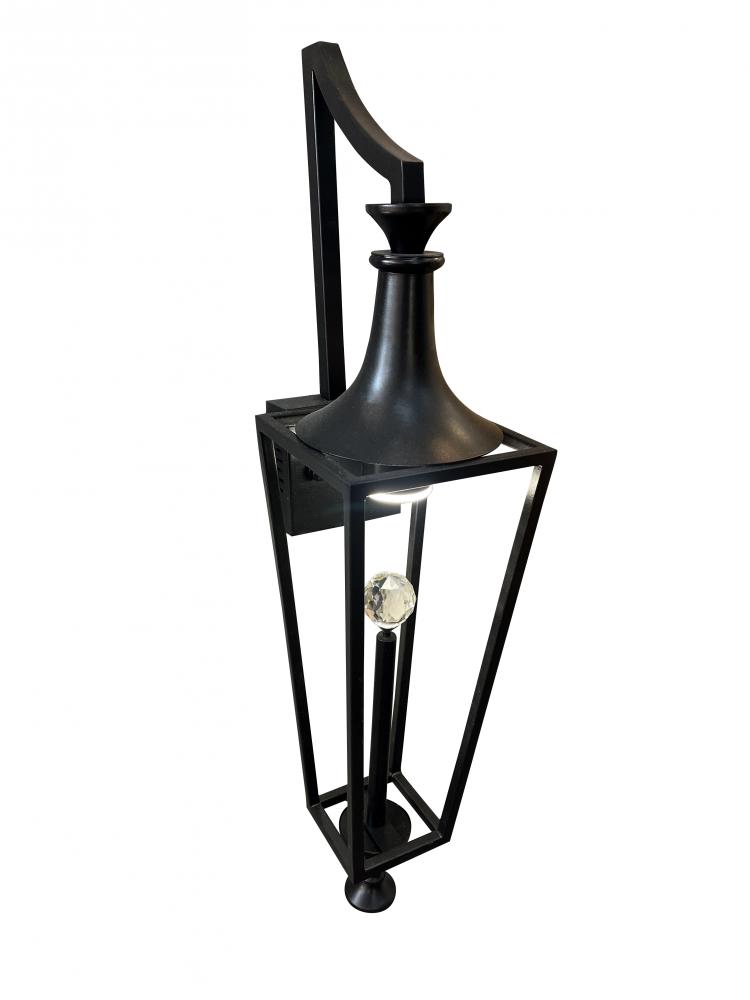 This wall sconce is a black outdoor wall sconce. It comes with a clear crystal ball accent. The materials for this wall sconce consists of metal, crystal and acrylic.