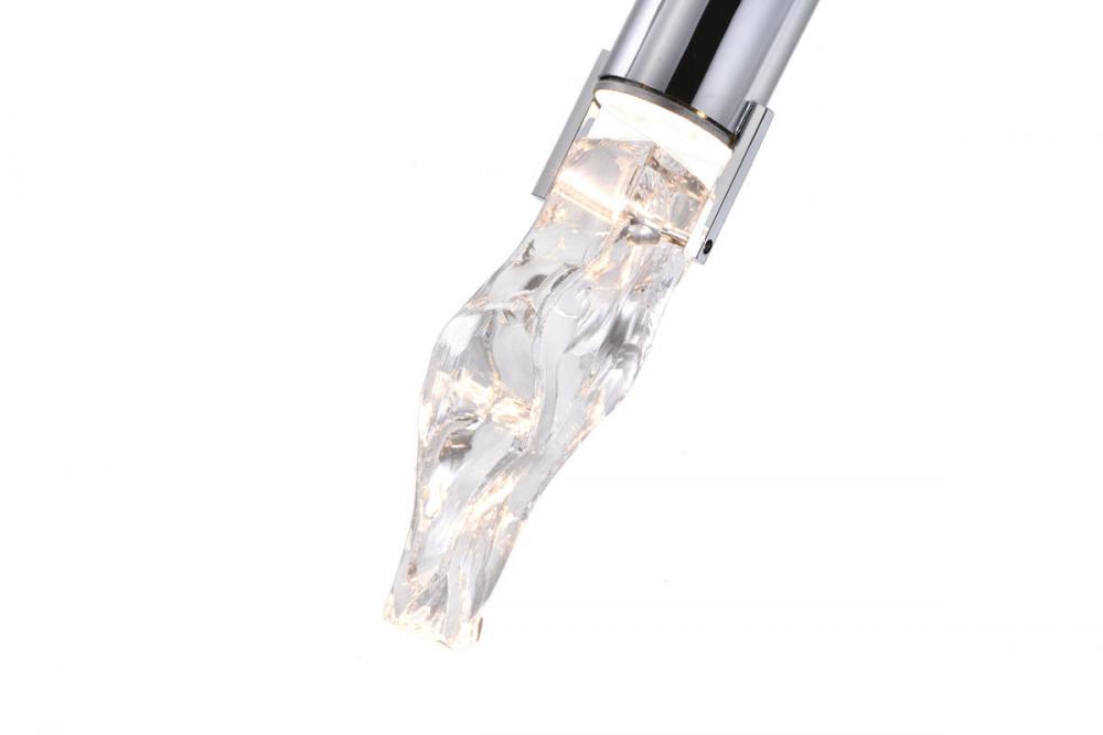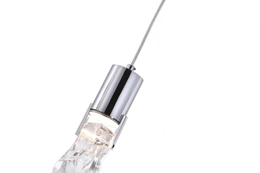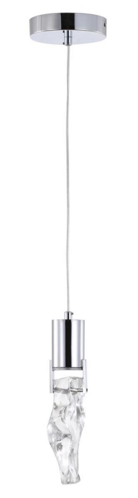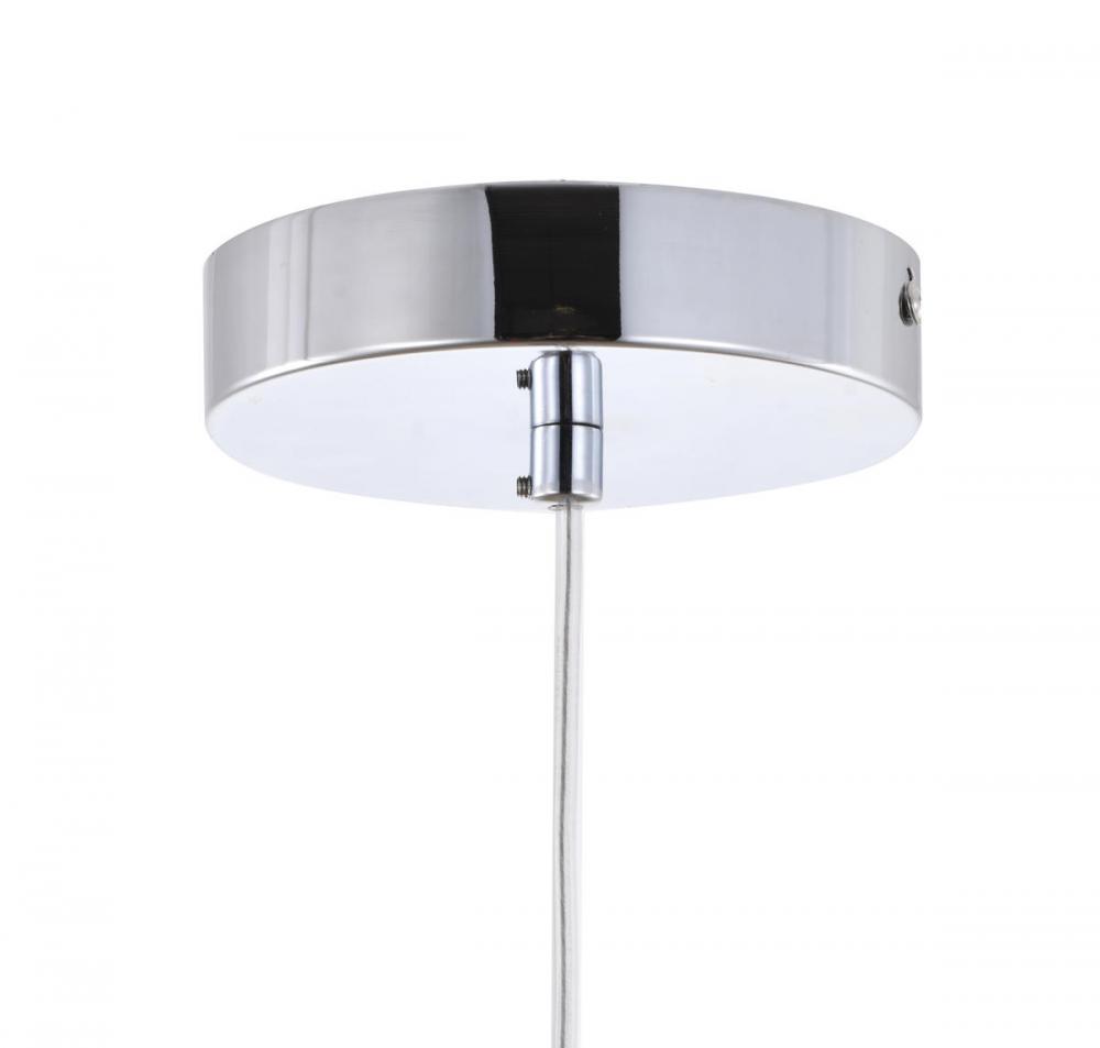 This exquisite LED pendant is in a chrome finish. The frame is made out of metal, and it comes with a clear crystal stone. The LED bulb is integrated into frame. The adjustable cord link makes this fixture suitable for most ceiling heights.